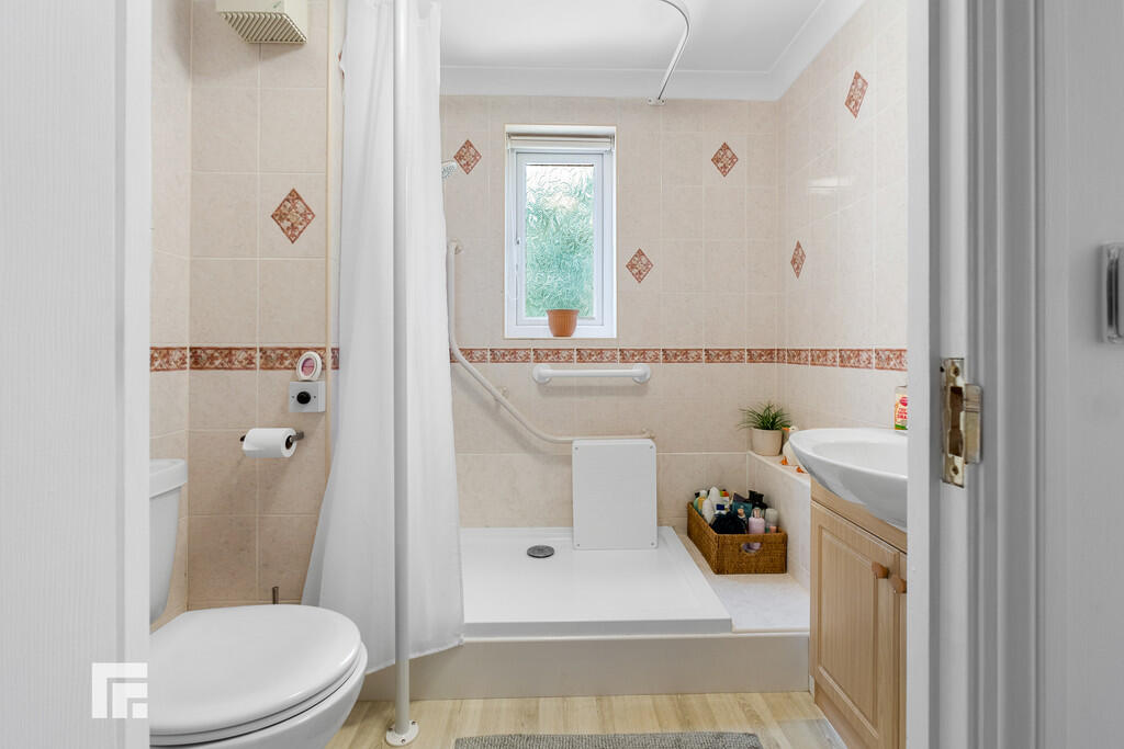 SHOWERROOM6' 10" x 5' 5" (2.09m x 1.67m) Vanity enclosed wash hand basin and mirror. Wide shower with drop down shower seat. Low level wc. Heated towel rail. Extractor fan. uPVC double glazed obscure window to side.