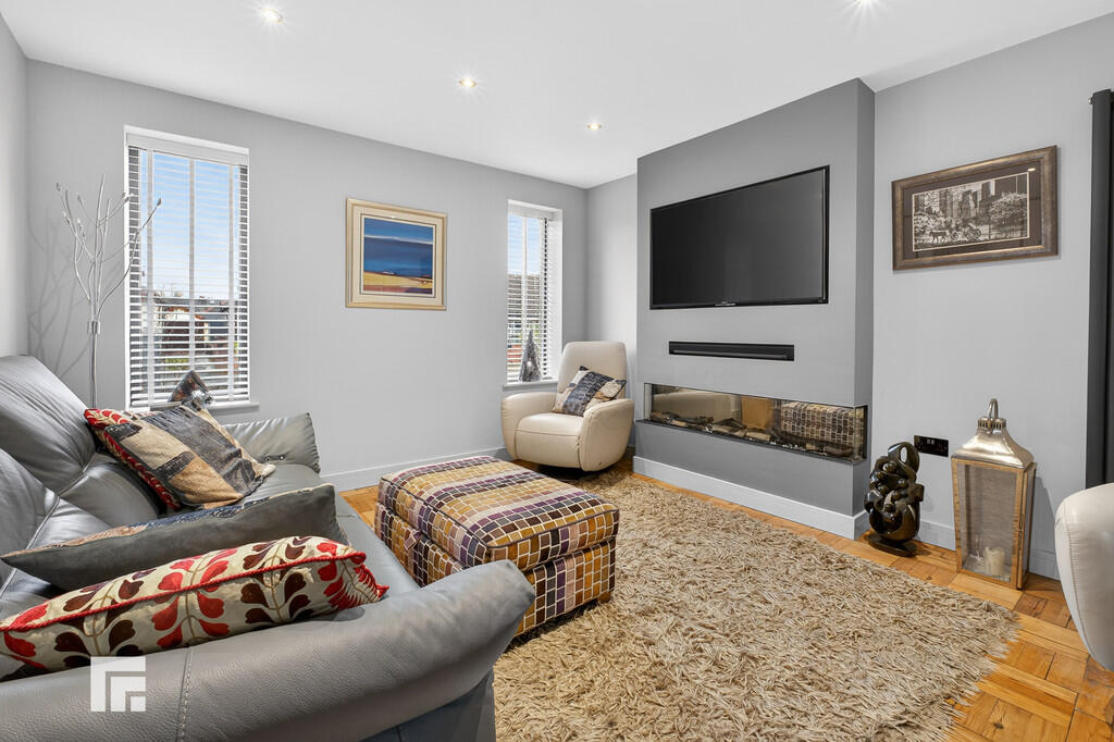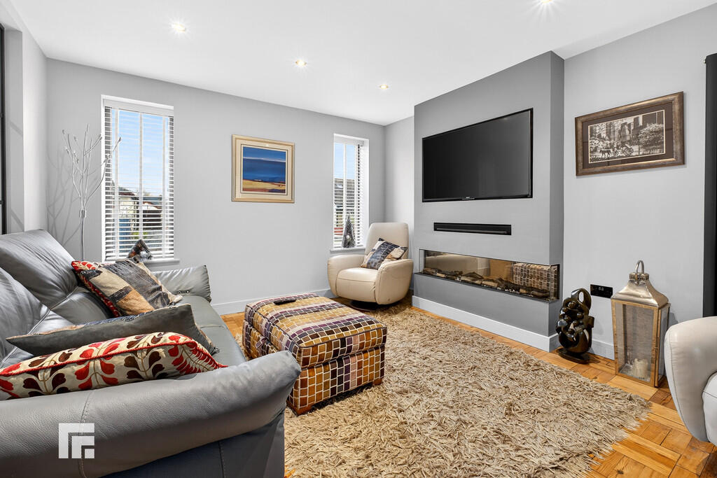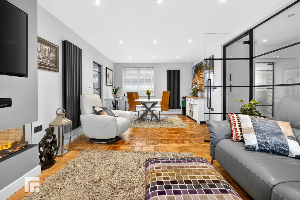 LOUNGE/DININGROOM22' 10" x 11' 11" (6.98m x 3.64m) Two upvc double glazed windows to front and further upvc double glazed window to rear. Spot lights to ceiling. Wood block flooring. Two wall mounted radiators. Crittal glazing overlooking hallway. Media wall with living flame coal/log effect fire.
