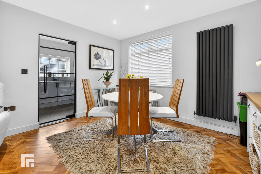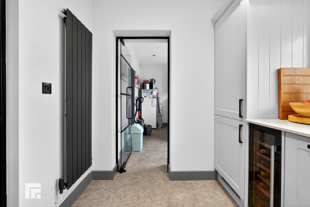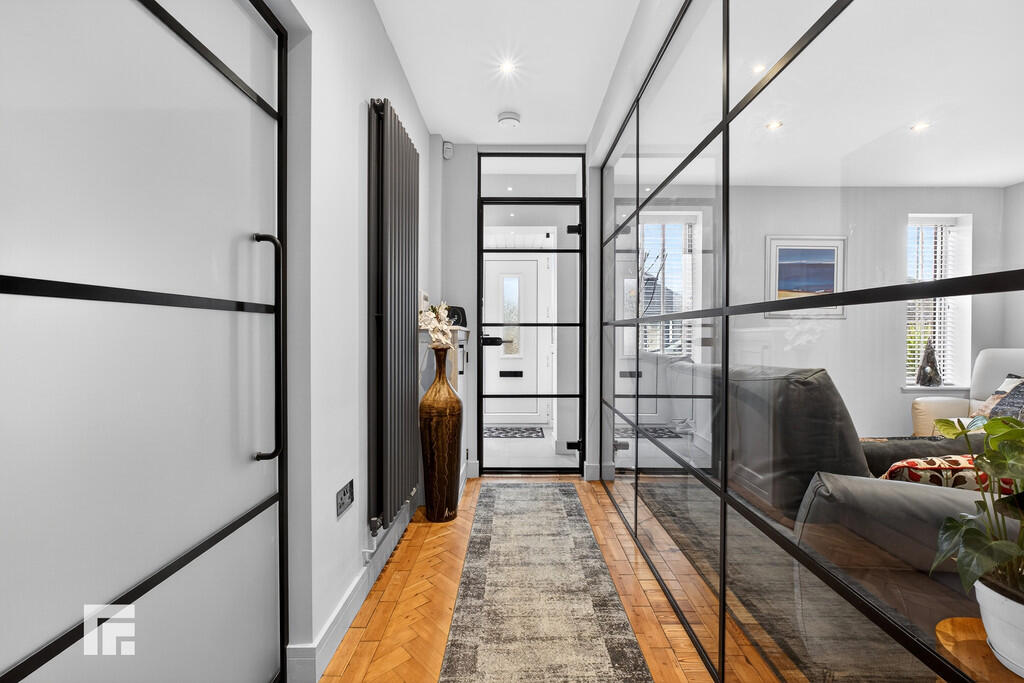 HALLWAY Entered via Crittal glazed door with panel over. Spotlights to ceiling with dimmer switch. Wood block flooring. Vertical wall mounted radiator. Crittal glazing over looking lounge. Cupboard housing gas and electric meters. Storage.