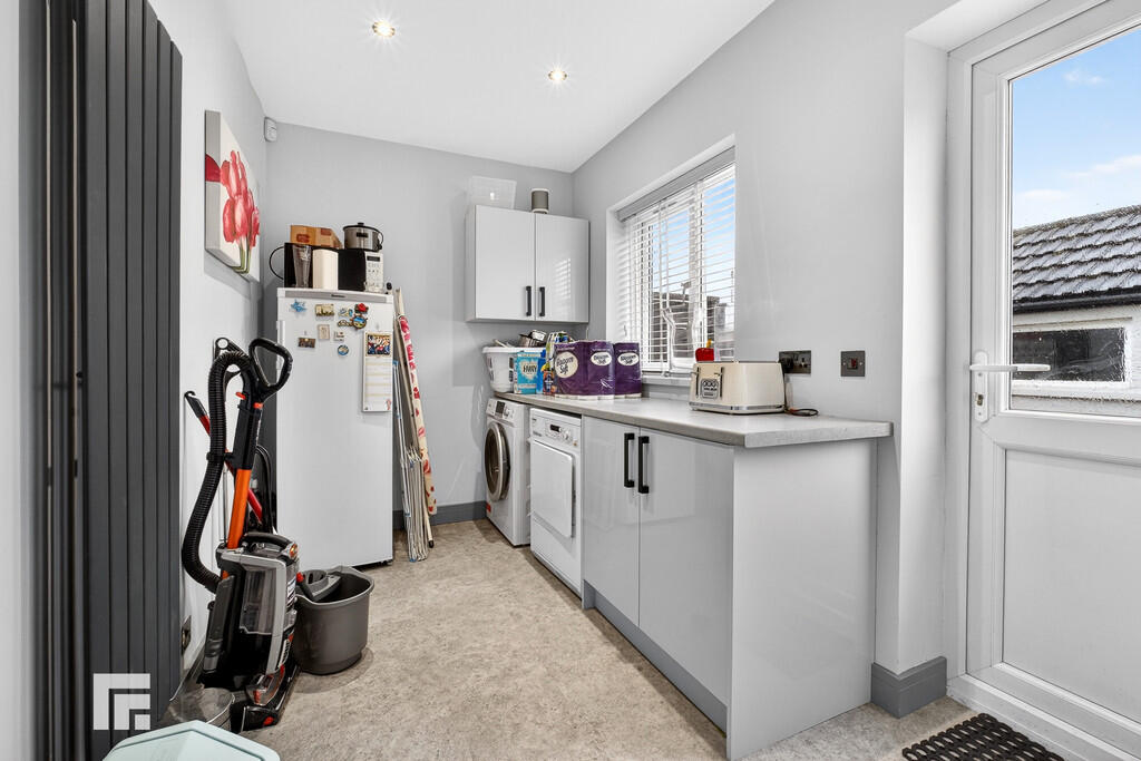 UTILITYROOM Upvc double glazed window to side. Upvc double glazed door to rear garden. Spotlights to ceiling. Wall mounted vertical radiator. Work surface with plumbing for washing machine and recess for tumble dryer. Wall mounted cupboard. Room for fridge freezer.