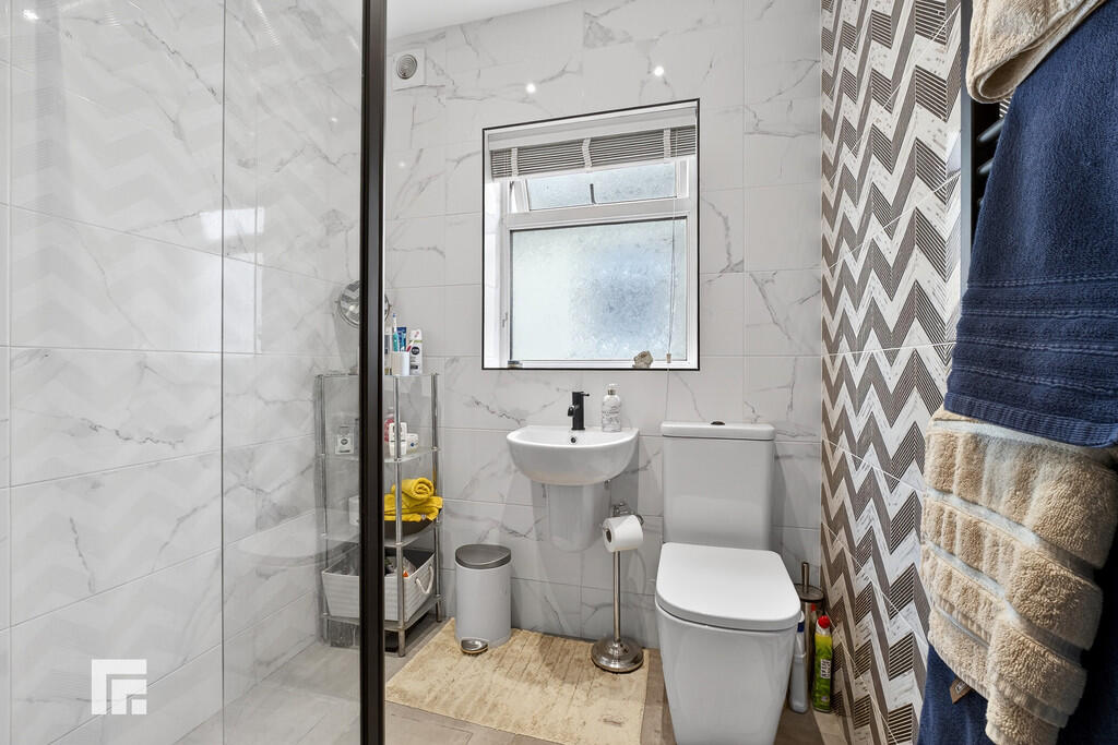 BATHROOM Upvc obscure glazed window to side. Spotlights to ceiling, Fully tiled walls.. Three piece suite comprising wall hung wc, wash hand basin and walk in shower cubicle with rainfall shower head. Extractor fan. Heated towel rail.