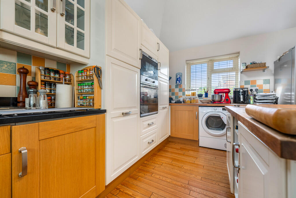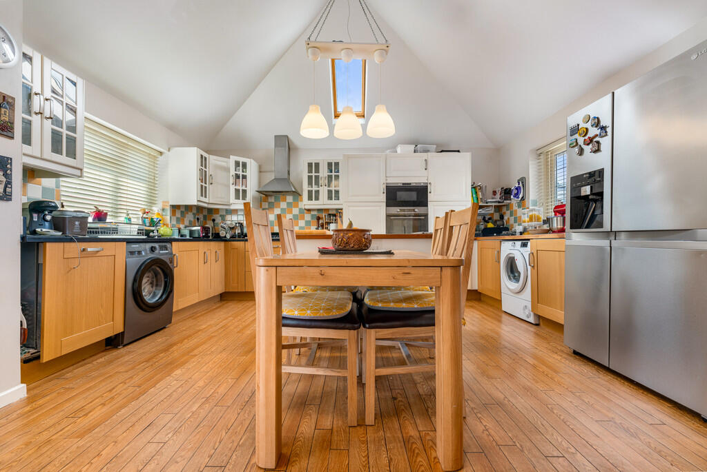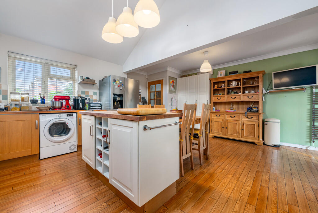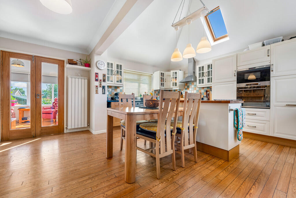 KITCHEN/DININGROOM18' 4" x 16' 6" (5.59m x 5.05m) A delightful open plan kitchen/diner with feature vaulted ceiling and double glazed Velux window to side. The kitchen is fitted with a wide range of base, eye level and full height units incorporating one and a half bowl stainless steel sink with complementary granite work surfaces. Fitted electric microwave, oven and five burner gas hob with extractor hood over. Tiled splash backs. Feature central island with wine rack and oak work surfaces. Space for American fridge/freezer, washing machine and tumble dryer. Wood flooring. uPVC double glazed windows to front and rear. Two vertical radiators. Glazed oak double doors to conservatory.