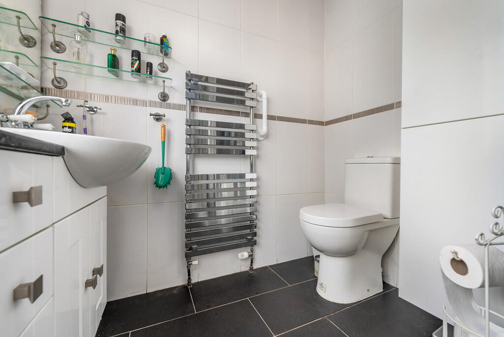 ENSUITE8' 0" x 6' 5" (2.45m x 1.96m) A spacious en-suite comprising low level WC, vanity enclosed wash hand basin and fitted double shower cubicle. Tiled flooring and partly tiled walls. uPVC double glazed obscure window to front. Ladder radiator.