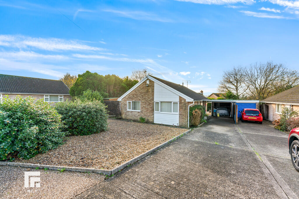 FRONT Front garden with evergreen shrubs on stoned area. Driveway with parking for up to five vehicles. Metal double gates leading to carport and garage. Side gate into rear garden.