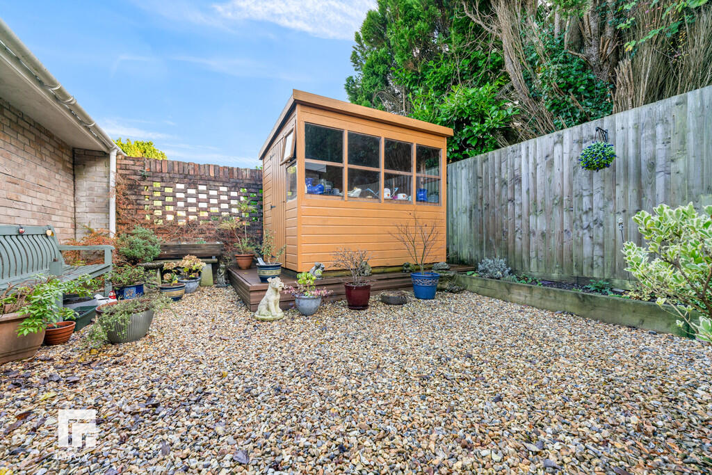 REARGARDEN Bordered by a timber fence and hedges, a beautifully maintained enclosed rear garden. Large paved patio area, stone area with mature trees and shrubs. Lawn area. Timber shed. gate to side for access. Garden room. Outside tap.