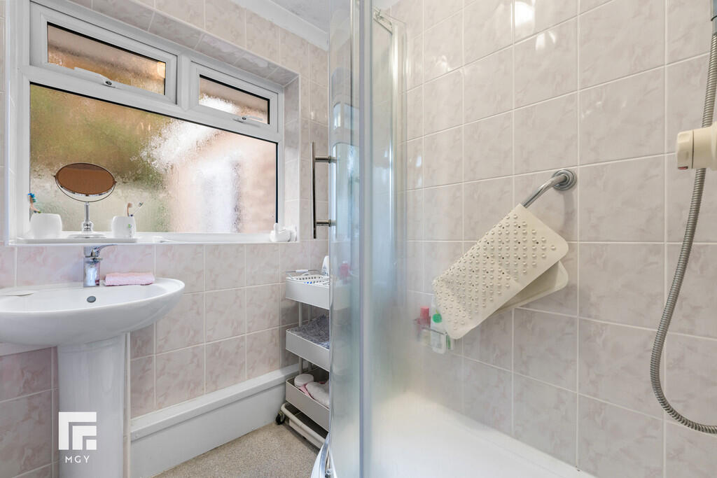 FAMILYSHOWERROOM7' 8" x 5' 1" (2.36m x 1.55m) White suite; pedestal wash hand basin with chrome mixer tap, corner shower cubicle with chrome shower and curved glass sliding doors. Radiator. Tiled walls. Obscured glass uPVC window to side.