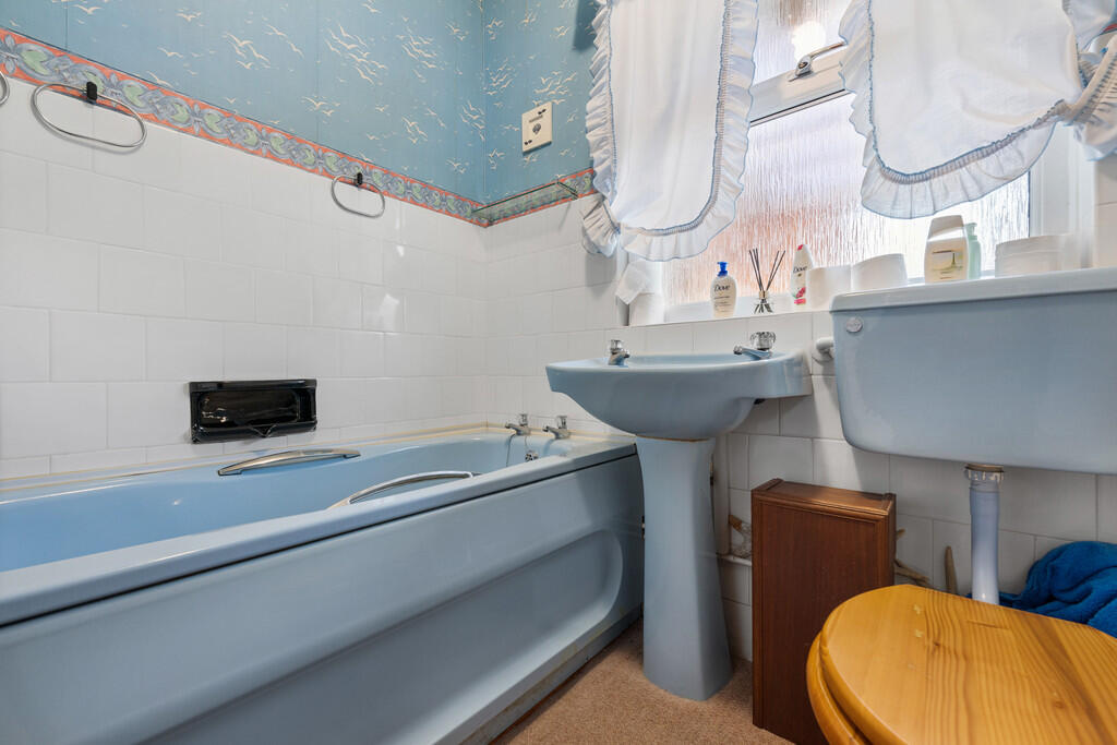 FAMILYBATHROOM6' 0" x 5' 6" (1.83m x 1.68m) Comprising low level wc, pedestal wash hand basin, panelled bath, obscure glass window to rear, wall tiling to half height and radiator.