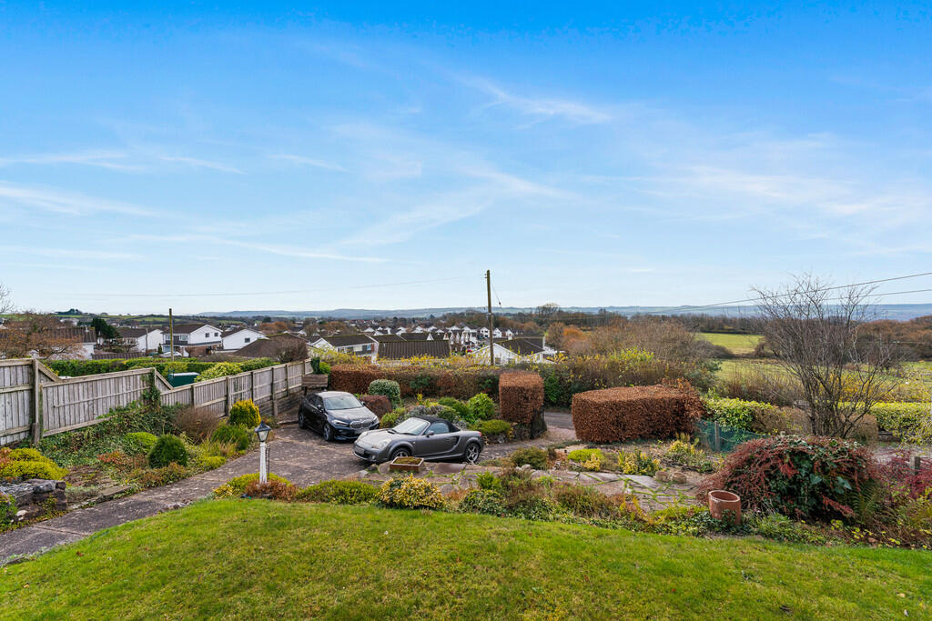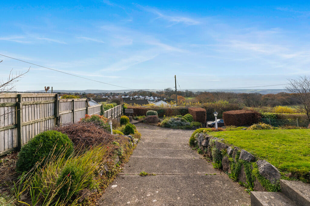 FRONTGARDEN Tiered front garden with areas of lawn, paving and inset plants and shrubs. Elevated views to front, long driveway and hedgegrow to front border. Path to side leading to rear garden.