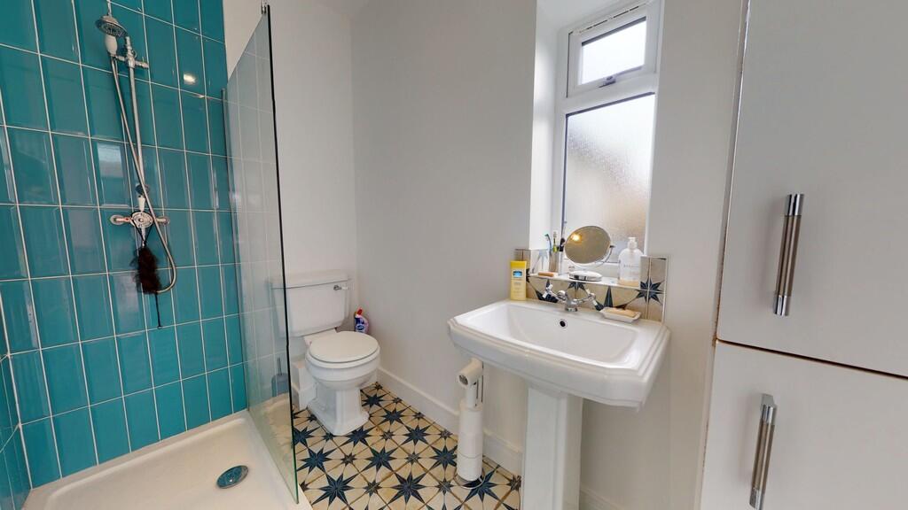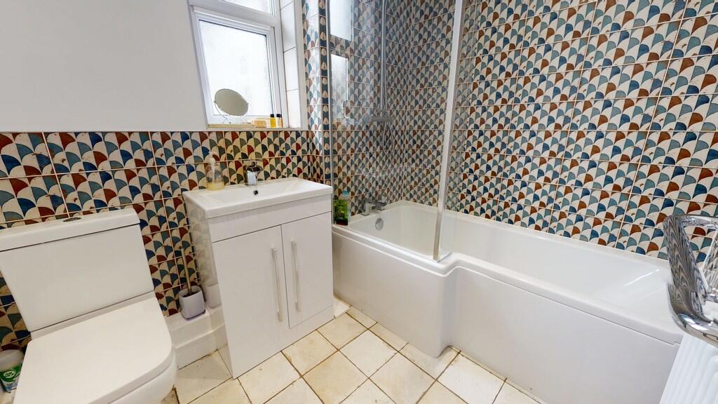 BATHROOM8' 0" x 6' 2" (2.44m x 1.88m) Obscured double glazed uPVC window to rear. Tiled floor. Part tiled walls. W.c, vanity enclosed wash hand basin with inset sink unit, mixer tap and storage below, shower bath with mixer tap and with mains shower over. Radiator with towel rail. Spotlights.