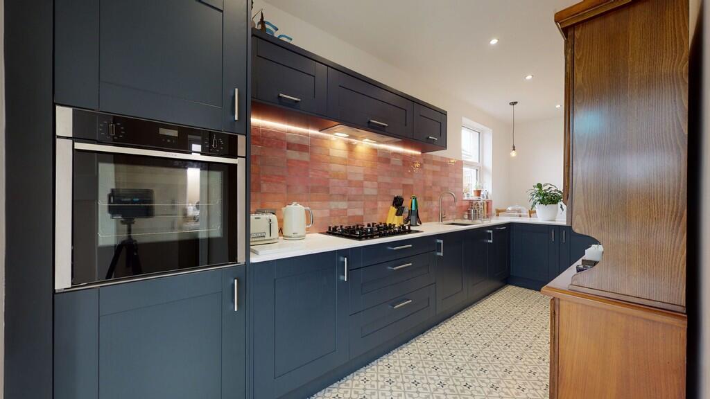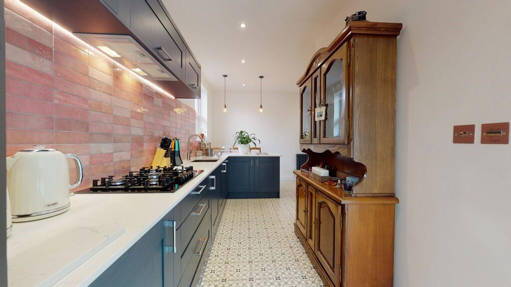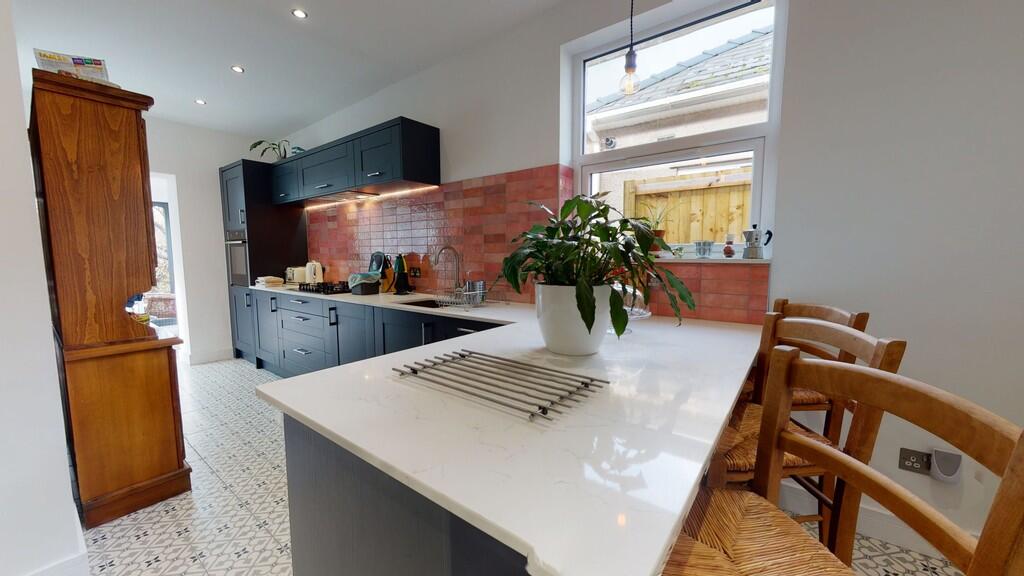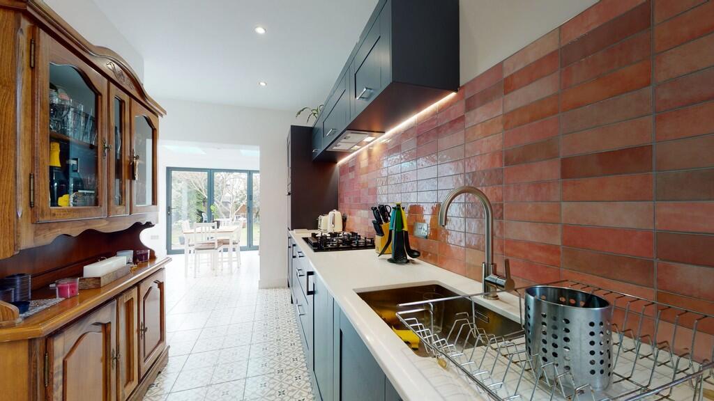 KITCHEN19' 10" x 10' 8" (6.05m x 3.25m) An exquisite newly refurbished kitchen. Double glazed uPVC window to side. Tiled floor. Fitted base and wall units with quartz work surfaces with inset sink unit and mixer tap. Built in oven and 5 ring gas hob with extractor over. Chrome switches and sockets. Built in dishwasher. Open to dining room. Door to:-