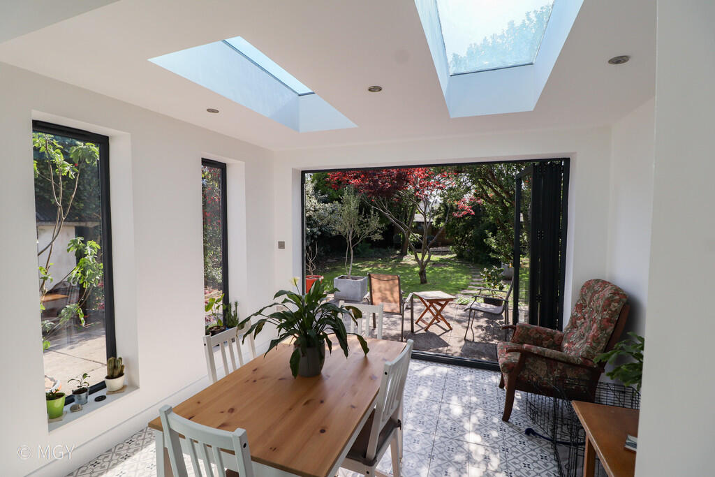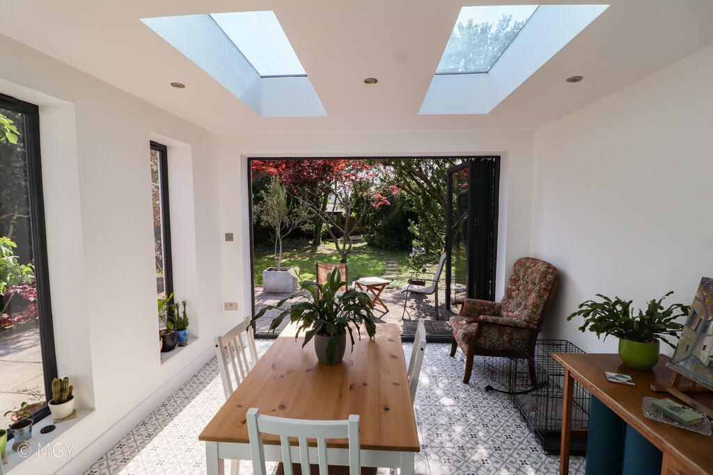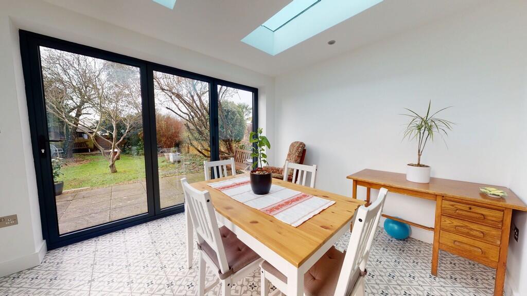 DININGROOM10' 8" x 8' 10" (3.25m x 2.69m) 2 double glazed windows to side. Bi-fold doors to rear garden. 2 skylights. Spotlights. Tiled floor. Radiator.
