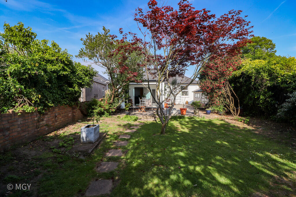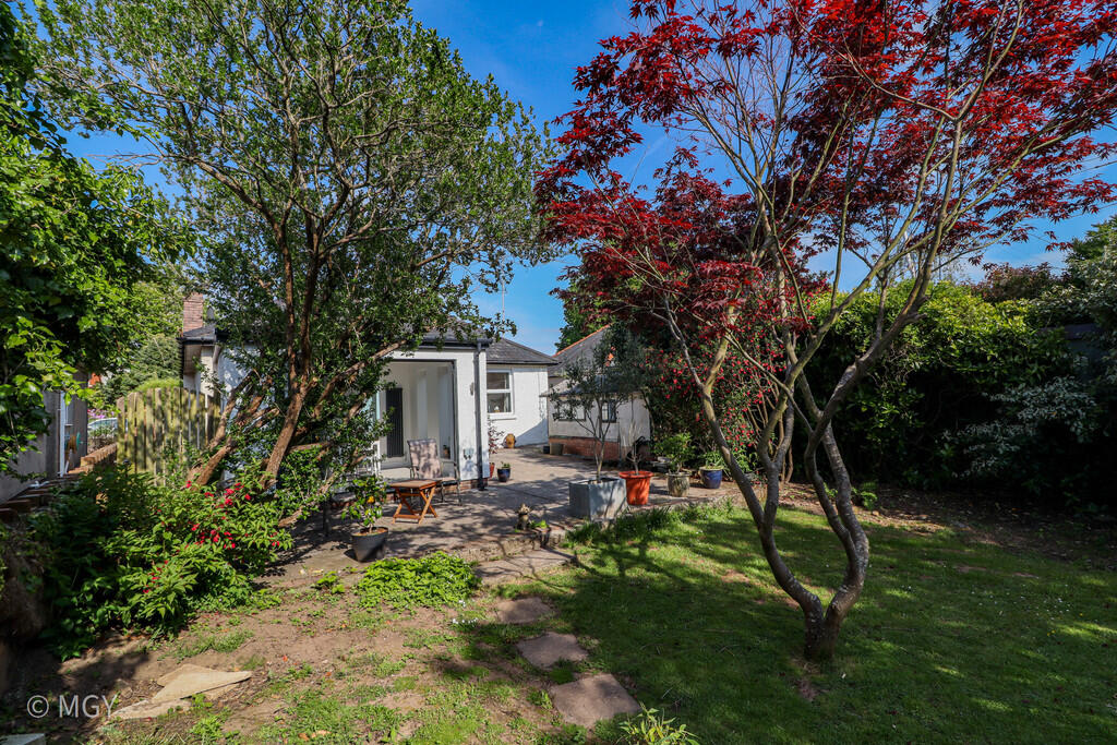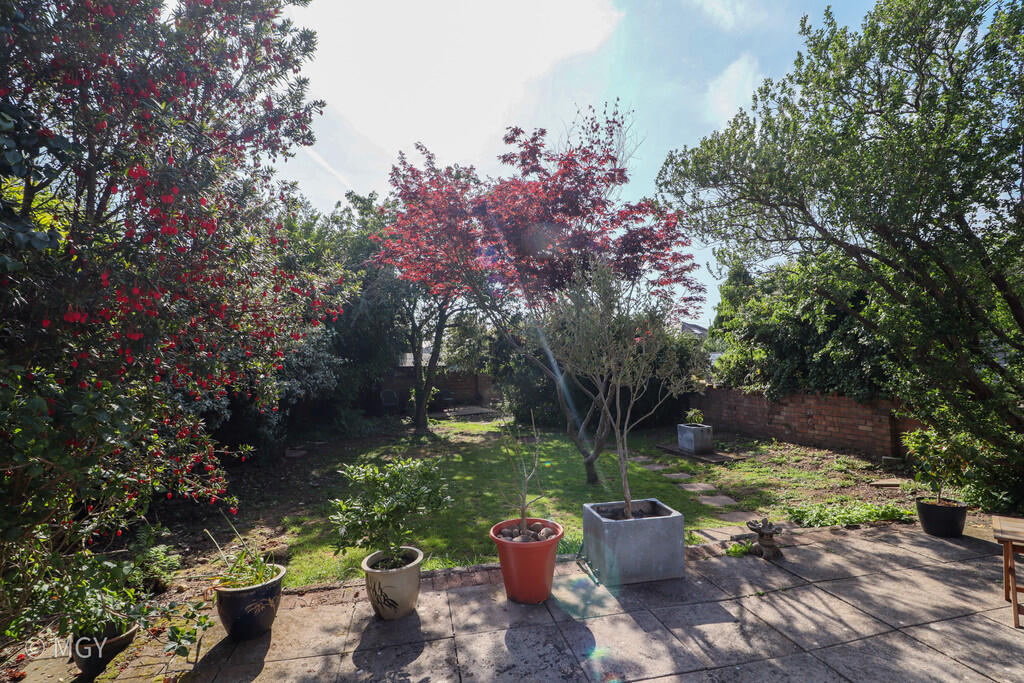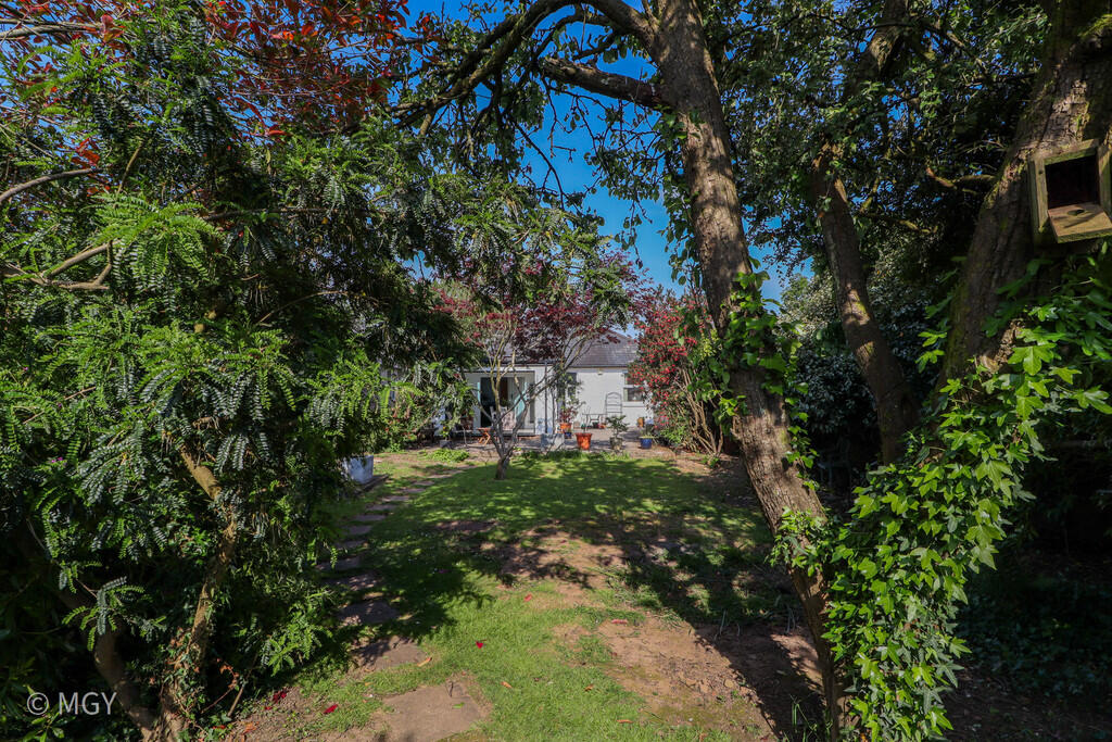 REAR- A generous private garden mainly laid to lawn with mature trees and shrubs. Storage garage. Shed.