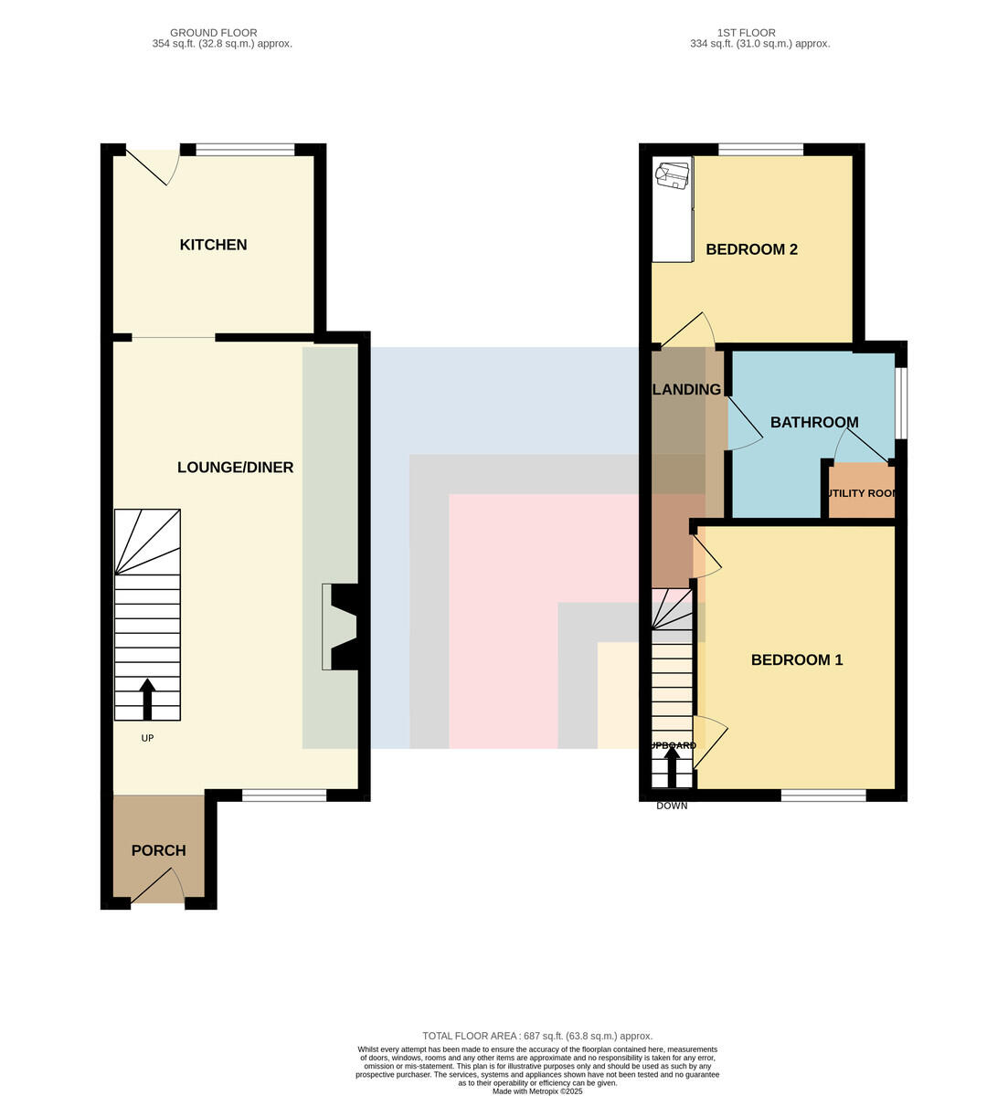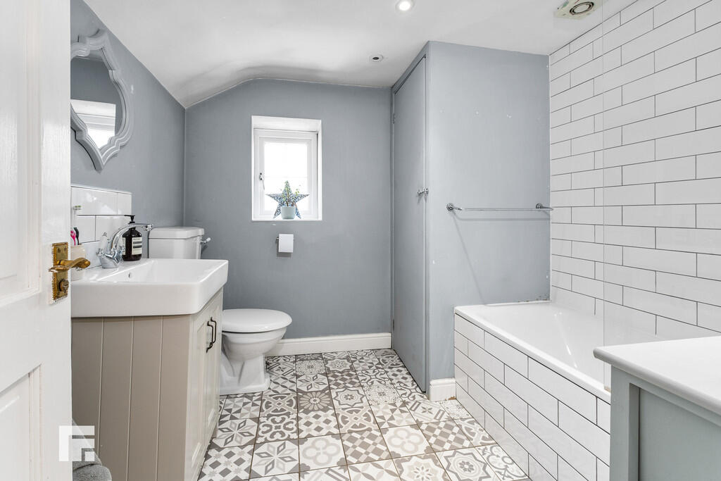 FAMILYBATHROOM7' 11" x 7' 10" (2.43m x 2.39m) White suite; low level WC, wash hand basin with chrome mixer tap and vanity, bath with chrome mixer tap and shower. Built in utility cupboard with plumbing for washing machine and space for tumble dryer. Tiled flooring and splashbacks. Radiator. Extractor fan. Spotlights. Obscured glass window to rear.