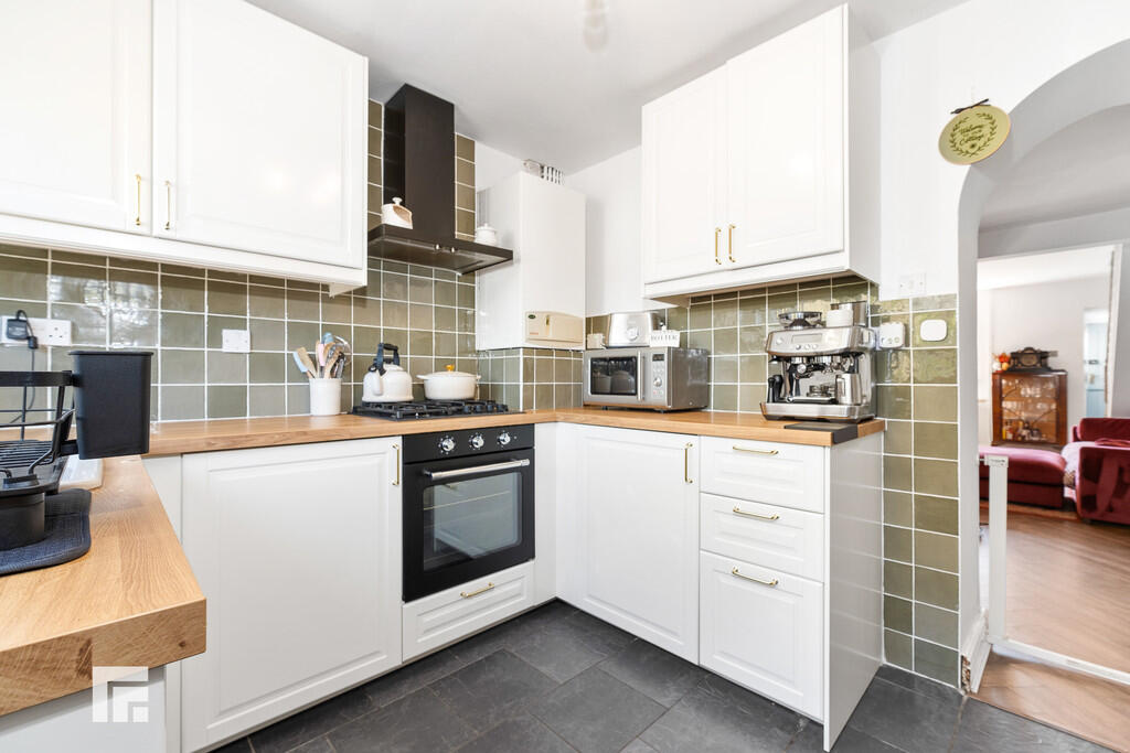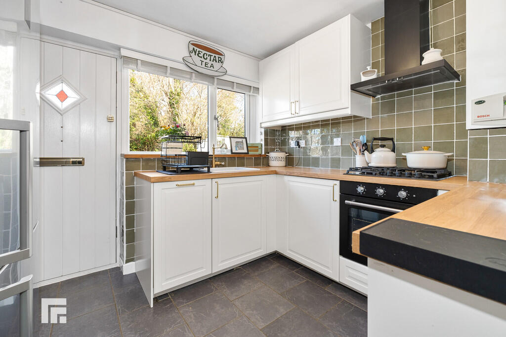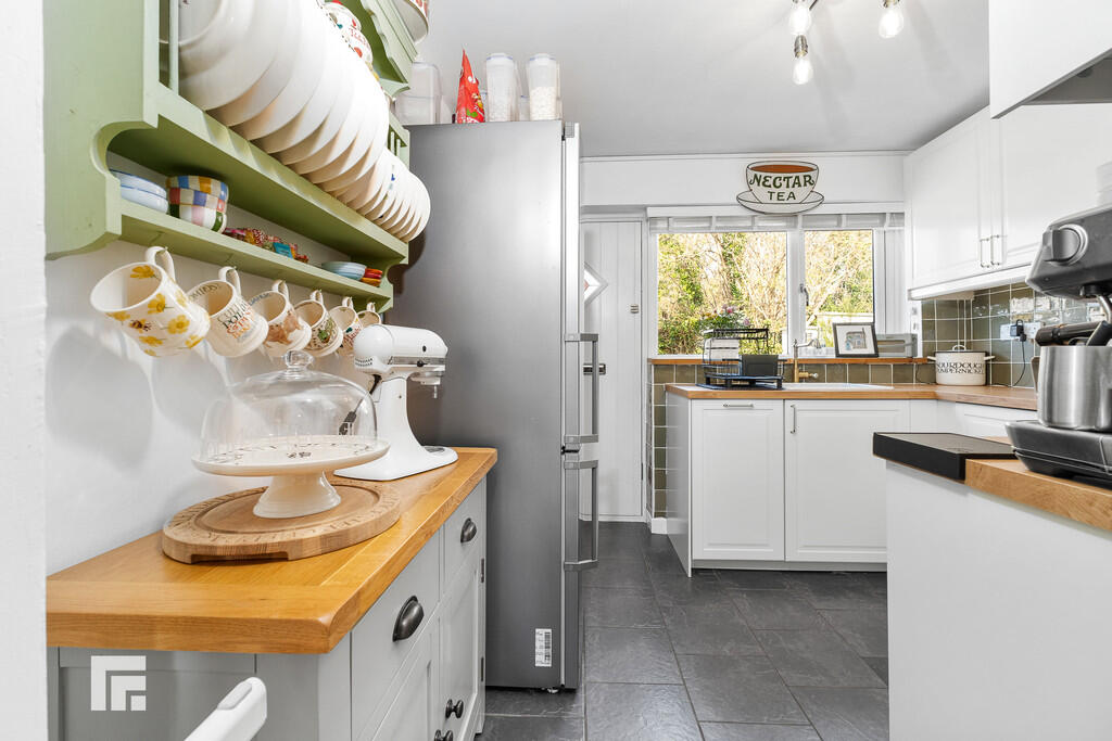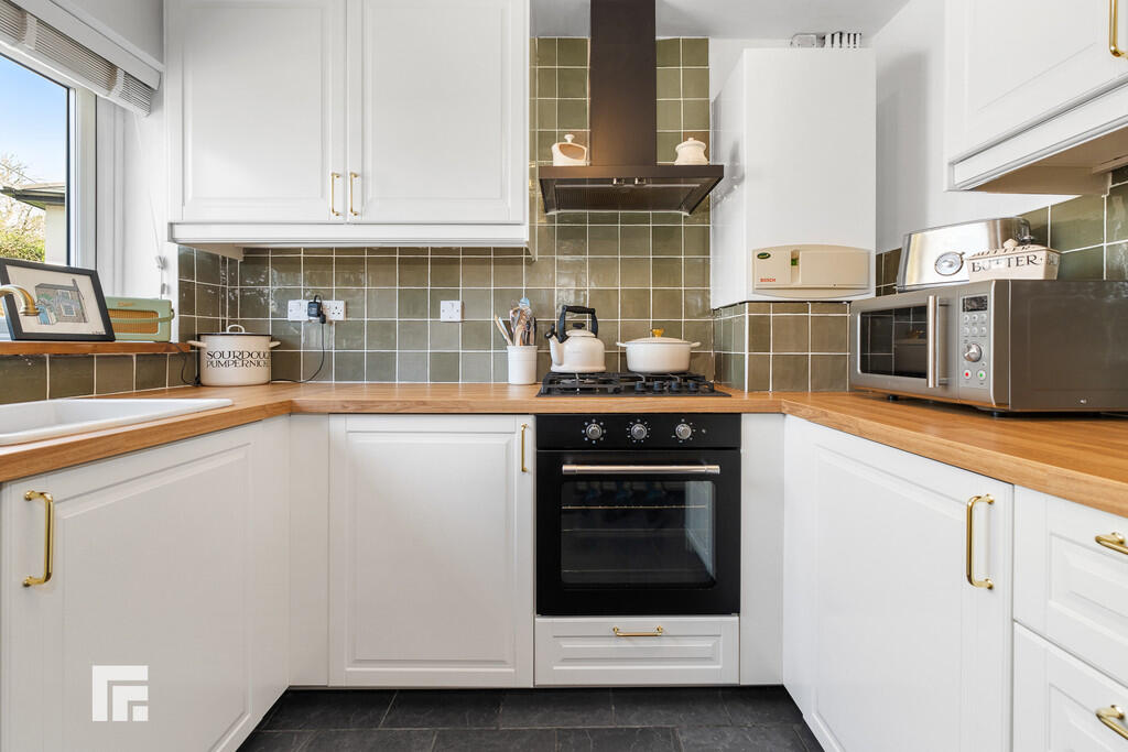 KITCHEN9' 10" x 8' 7" (3.00m x 2.64m) Double glazed composite door and uPVC double glazed window to rear. The kitchen is fitted with a range of base and eye level units incorporating ceramic sink with complementary work surfaces. Fitted electric oven with gas hob and extractor hood over. Integrated dishwasher. Space for fridge/freezer. Wall mounted gas combination boiler. Tiled flooring and splash backs.