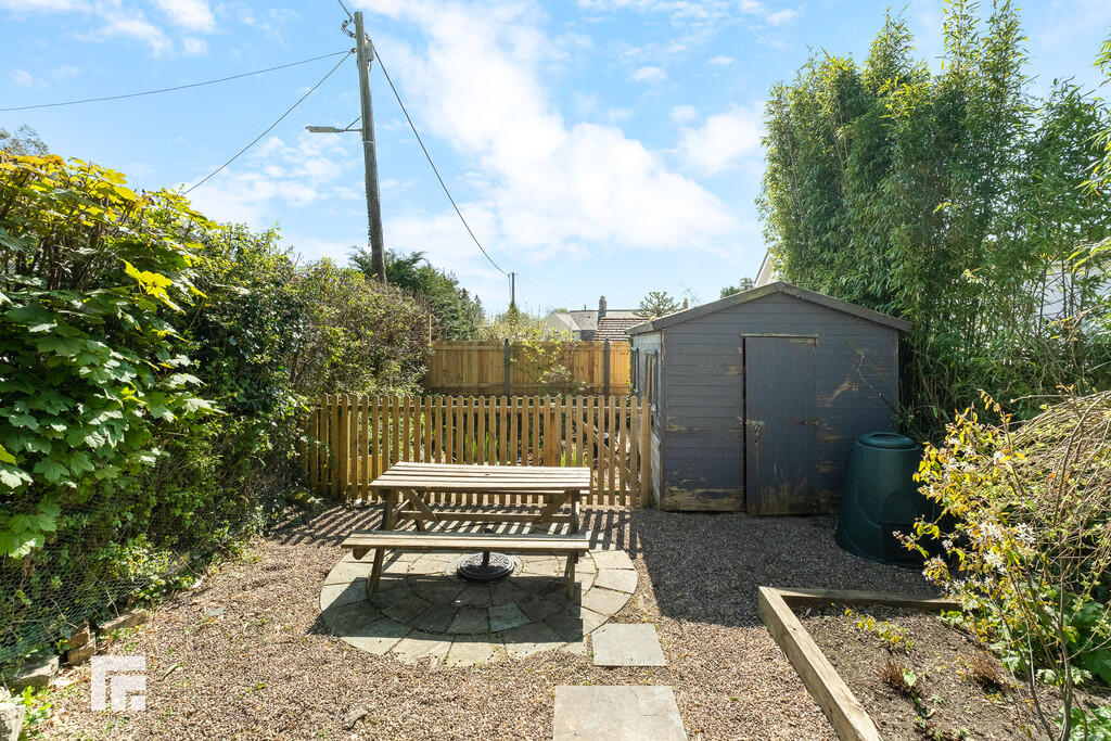 FRONT South facing, sunny garden with paved pathway leading from side gate (for access) to front door. Paved patio and area laid to lawn. Bordered by hedges, timber fence and mature shrubs. Additional seating area. Timber shed. Vegetable patch. Timber gate to side.