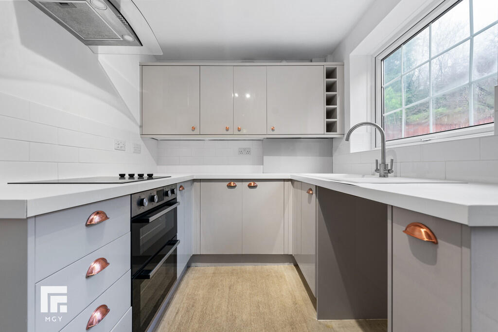 KITCHEN11' 8" x 6' 11" (3.58m x 2.12m) Well appointed along three sides in high gloss fronts beneath laminate worktop surfaces. Inset sink with side drainer. Inset four ring gas hob with curved glass cooker hood above and oven below. Matching range of eye level wall cupboards. Concealed 'Viessmann' gas central heating boiler. Tiled splash back. Window overlooking the rear garden. Door to garden. Chrome heater.