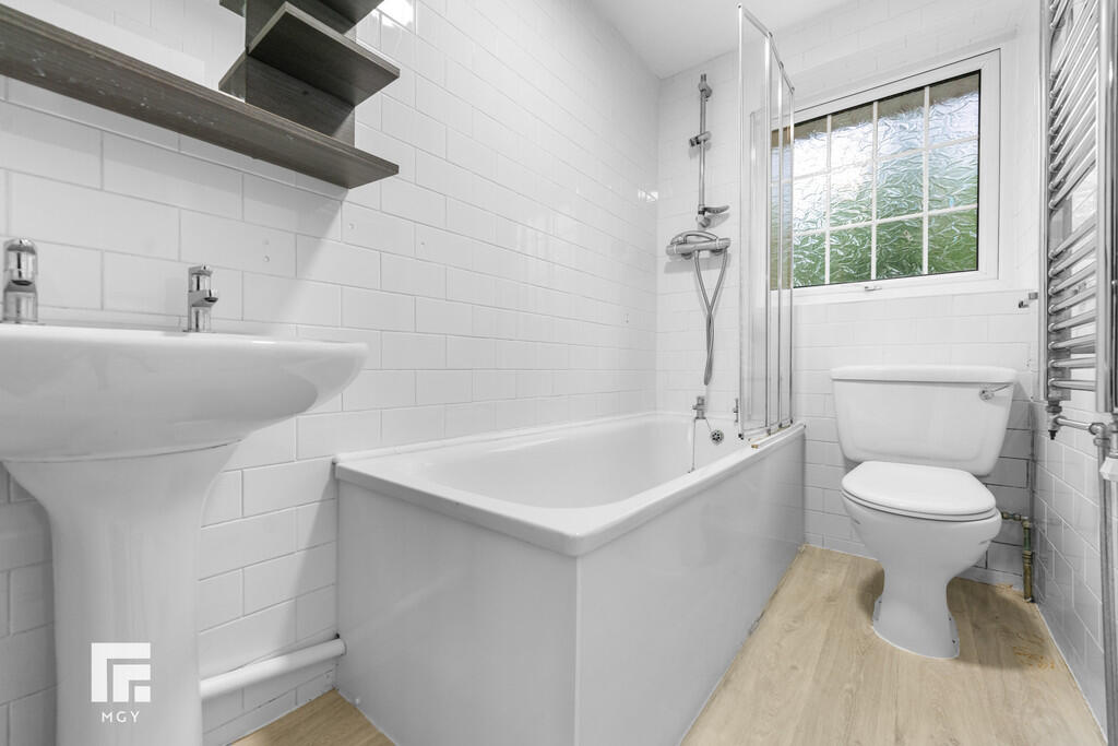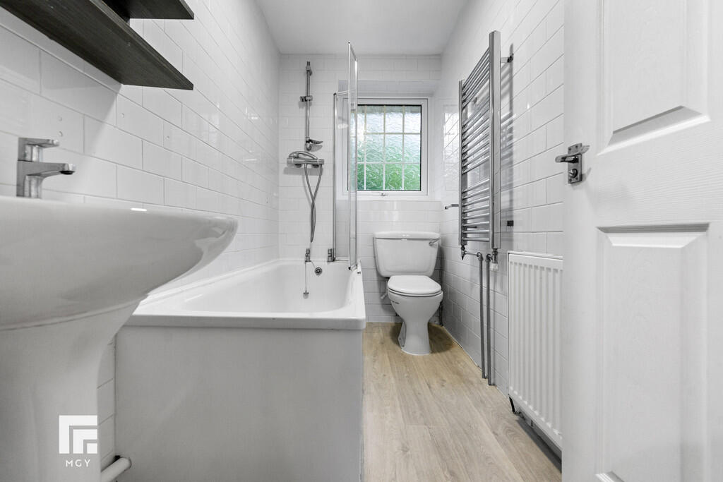 FAMILYBATHROOM White suite comprising low level wc, wash hand basin, panelled bath with chrome shower above and swivel shower screen. Obscured glass window to rear. Wall tiling. Radiator.