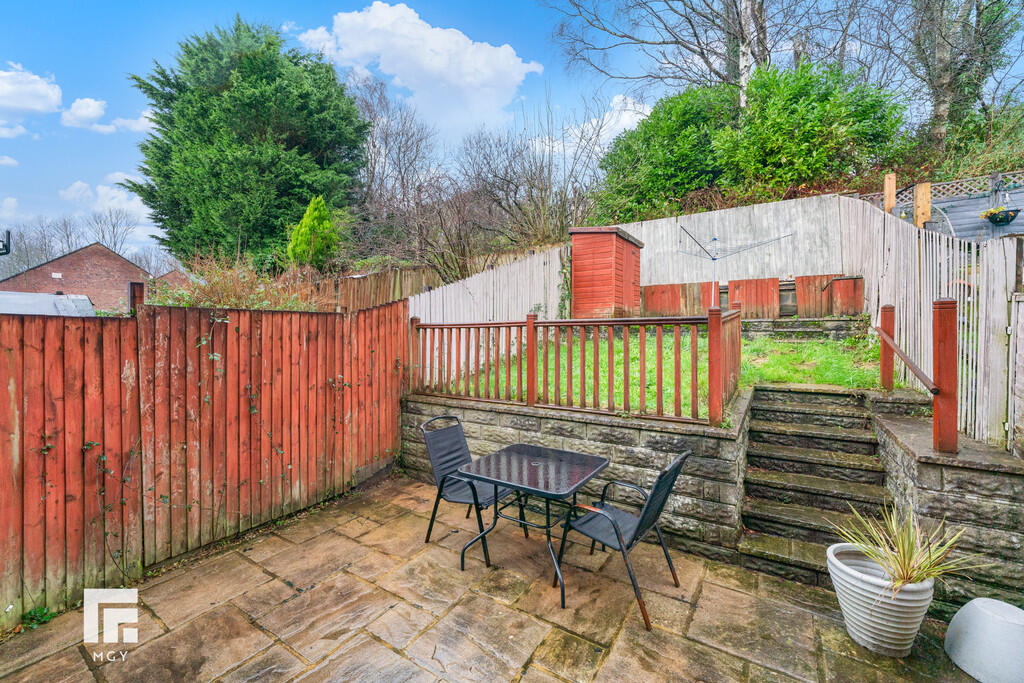REARGARDEN A delightful tiered garden with large paved patio leading up to an area of lawn with further paved patio and storage shed. Side access.