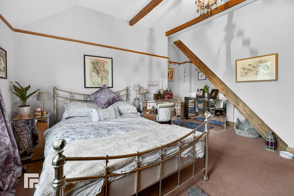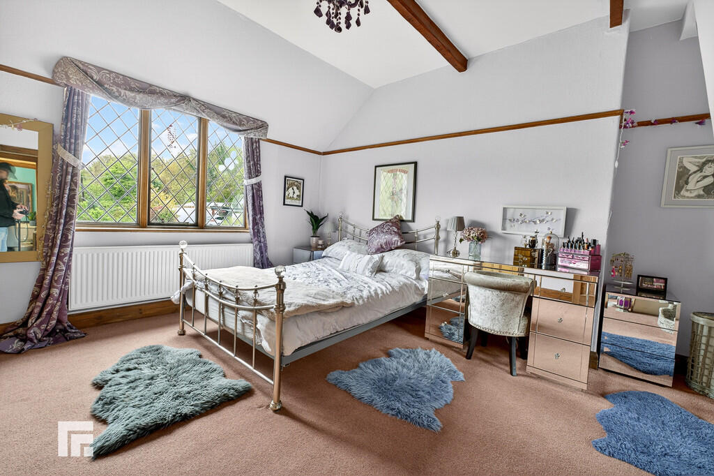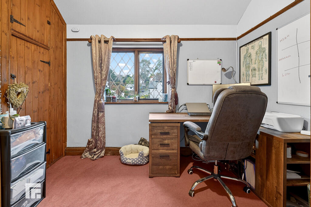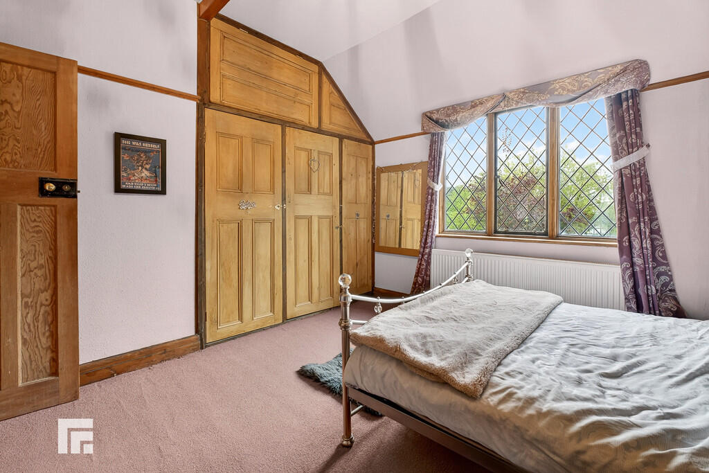 BEDROOMONE14' 6" x 13' 0" (4.43m max x 3.97m) A spacious primary bedroom. high ceiling with wooden beams. Built in wardrobes to one side. Radiator. Pretty diamond leaded window to front, with views across the extensive front gardens stretching across Church Road and adjacent open fields.