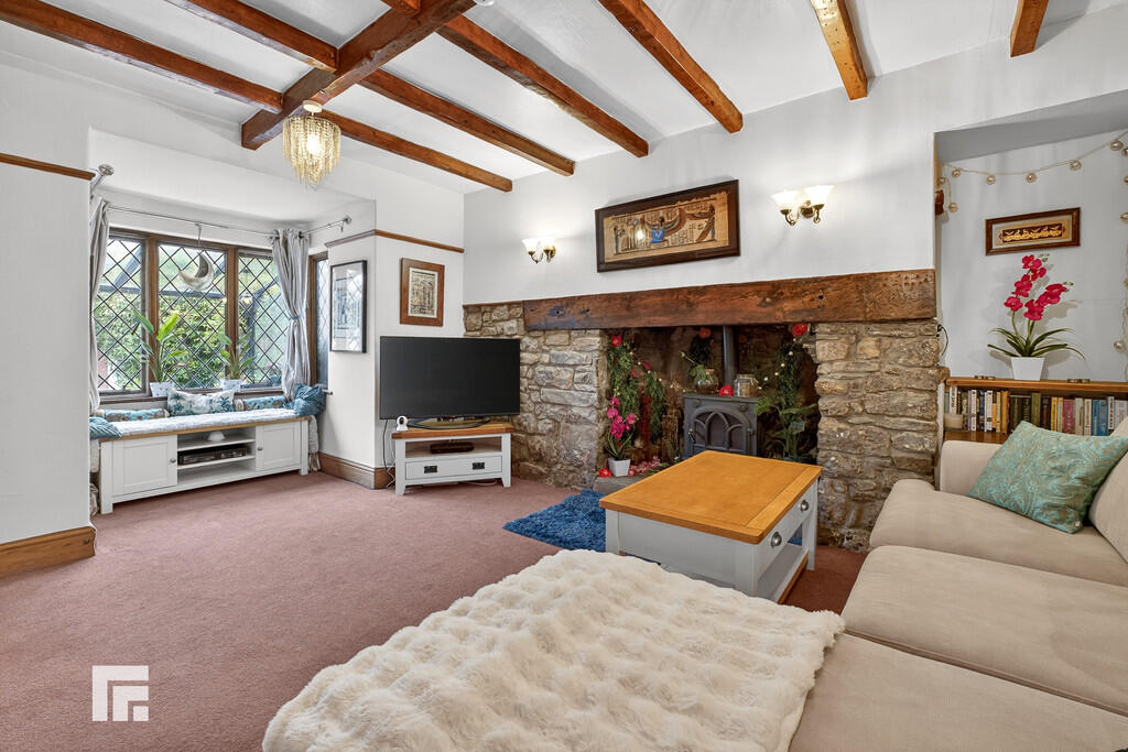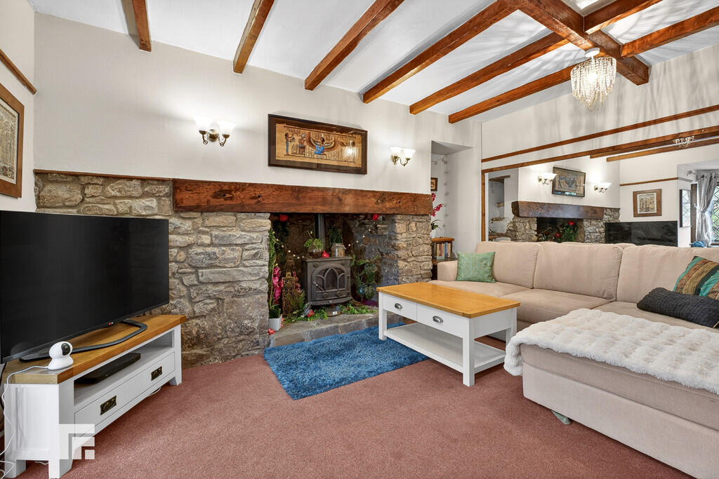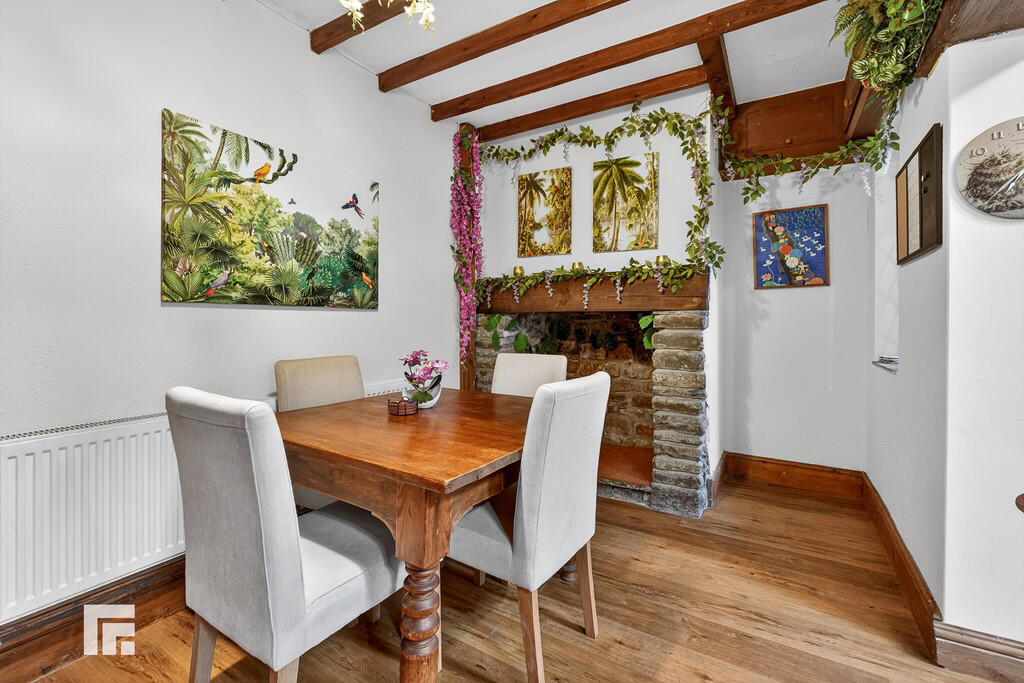 LOUNGE18' 2" x 11' 1" (5.56m into bay x 3.39m) Bay window to front with leaded windows providing a lovely outlook. Feature inglenook style stone fireplace with inset feature fire (not a working burner) and bread oven, stone hearth and inset solid wood lintel mantelpiece. Traditional beamed ceiling. Radiator. Opening through to kitchen/dining room.