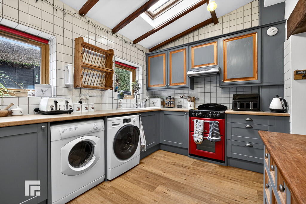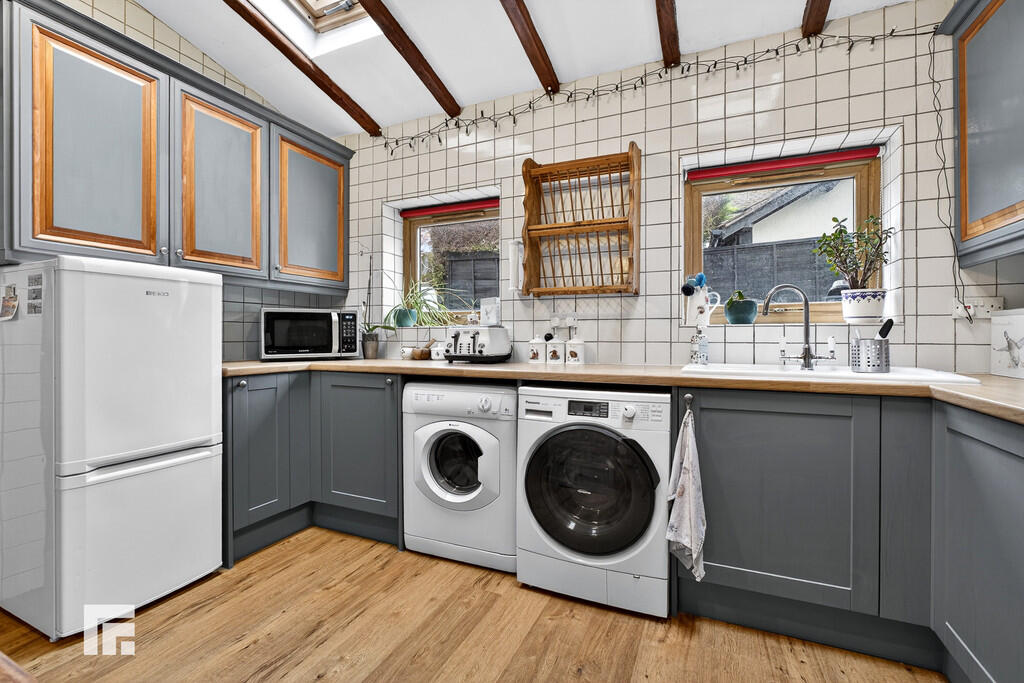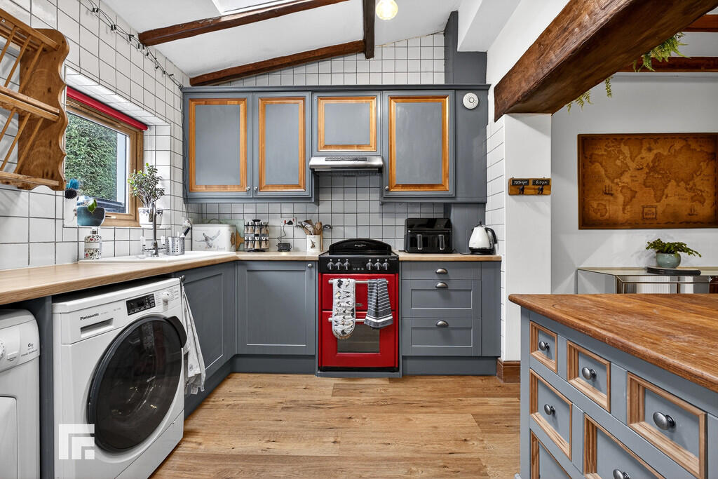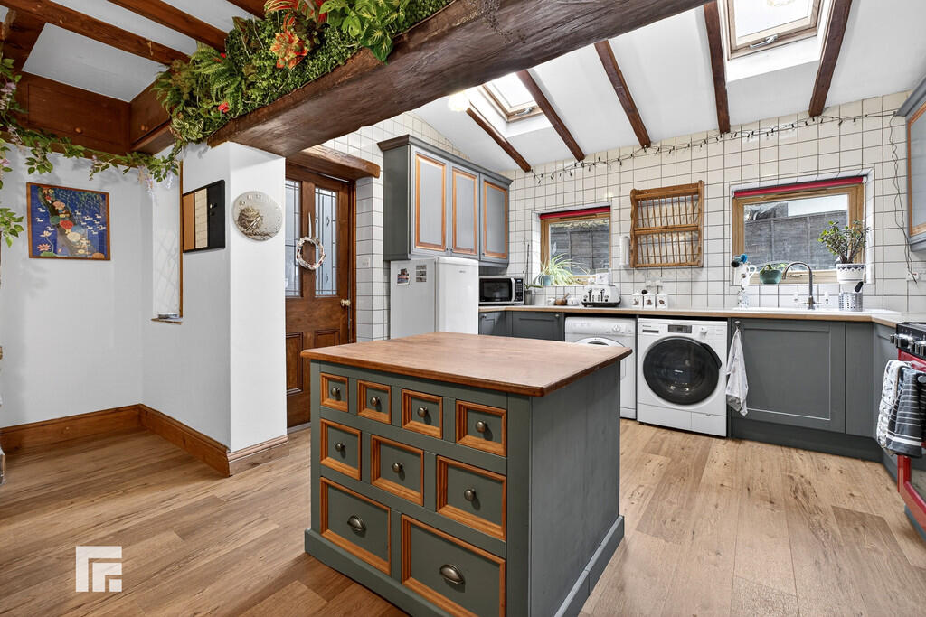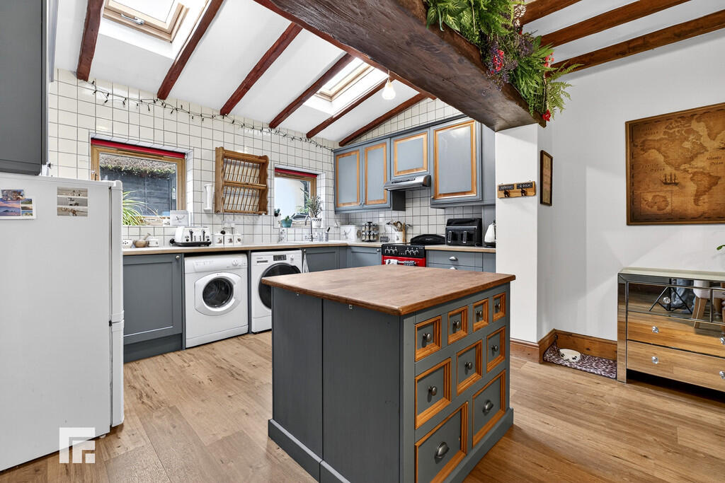 KITCHEN/DININGROOM17' 3" x 16' 4" (5.28m x 4.98m) Appointed along three sides, high and low level cupboards beneath quality laminate work surfaces, ceramic sink with side drainer and chrome mixer tap, free standing cooker/oven and extractor hood, fridge freezer, space for washing machine and space for tumble dryer. Central island with low level storage and wooden worktop. Opening with solid wood beam ceiling beams through to dining area. Ample space for dining table. Feature original stone open fireplace with wooden mantlepiece. Original wooden ceiling beams. Radiator. LVT flooring. Two Velux windows to rear. Two UPVC windows to rear. Tiled walls.