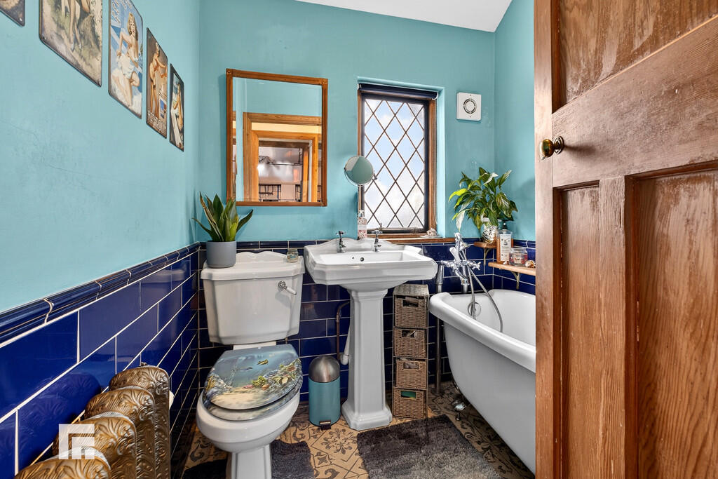 FAMILYBATHROOM6' 2" x 5' 10" (1.88m x 1.80m) A luxury bathroom suite to include a low level WC, pedestal wash hand basin and feature roll top bath Beautiful Victorian cast iron gas radiator. Tiled flooring and splashbacks. Extractor fan. Leaded window to rear.