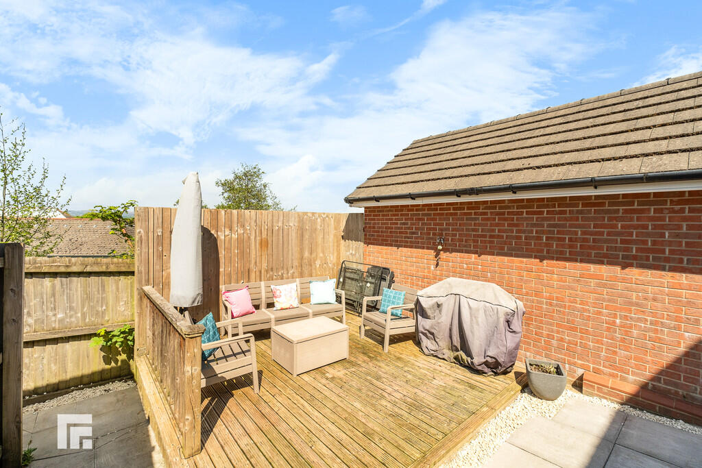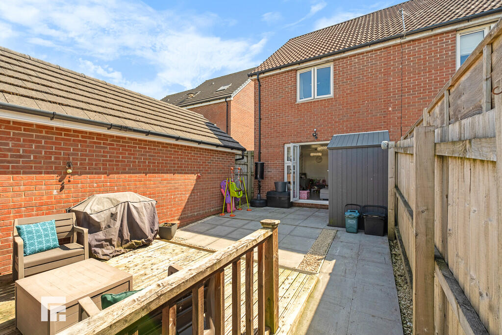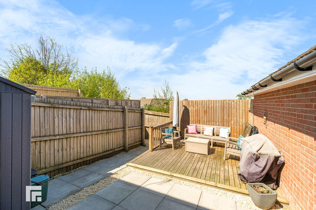 Rear - Laid to patio. Wall and fence border. Decked area to far end. Shingled areas. Gate providing side access.