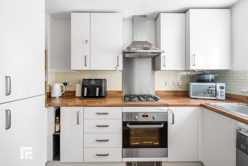 KITCHEN6' 0" x 10' 7" (1.83m x 3.23m) Modern fitted kitchen with a range of wall, base and drawer units with worktops over incorporating stainless steel sink and drainer with tap over and four ring gas hob with extractor above and oven beneath. Tile effect splashback. Vinyl tile effect flooring. Space for fridge/freezer and space and plumbing for washing machine. Power points. Double glazed uPVC window to front aspect.