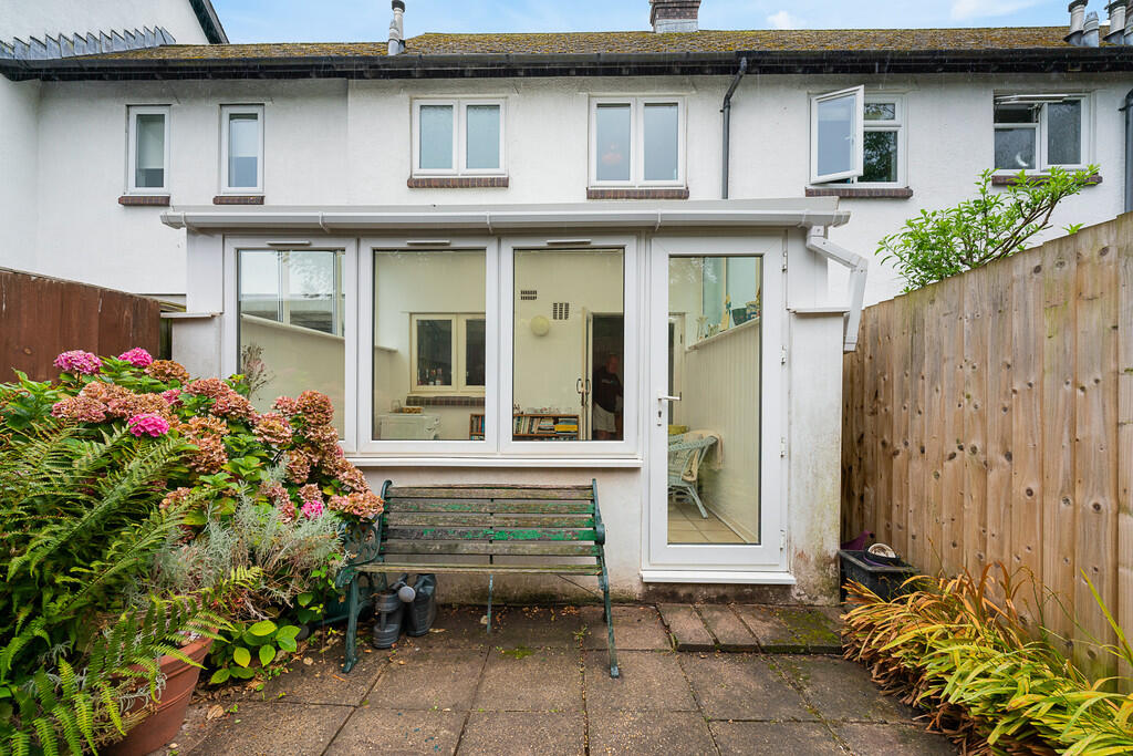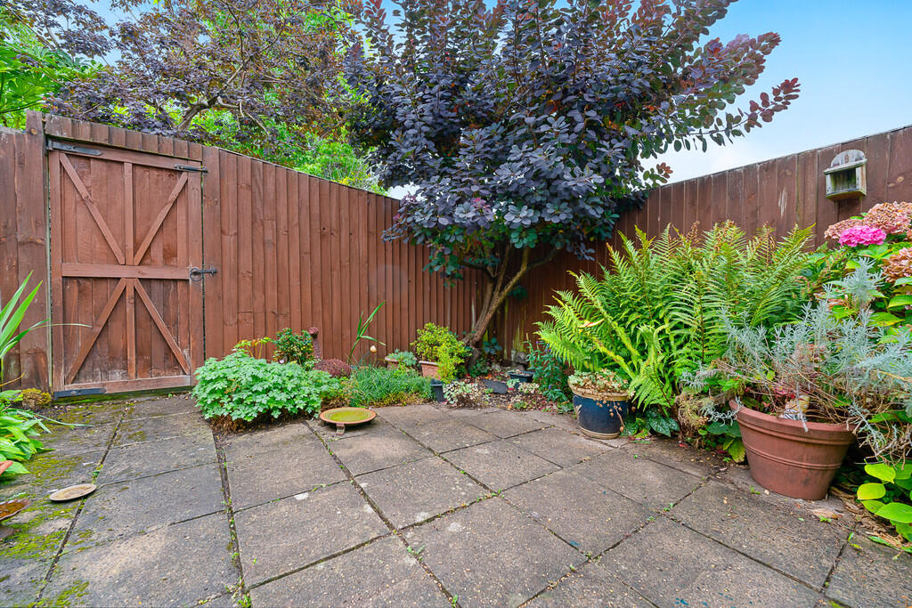 Rear - Laid to patio. Fenced border. Gate to shared footpath leading to garages.