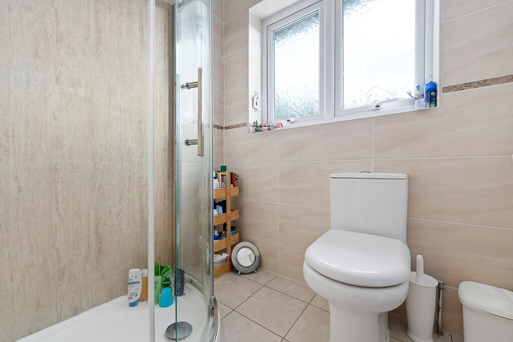 BATHROOM6' 6" x 5' 5" (1.99m x 1.67m) Vinyl flooring. Tiled walls. Spotlights. Obscure double-glazed windows to rear. WC. Pedestal wash hand basin with hot and cold tap over. Walk in shower cubicle with mains powered shower over and additional handheld attachment. Chrome heated towel rail.