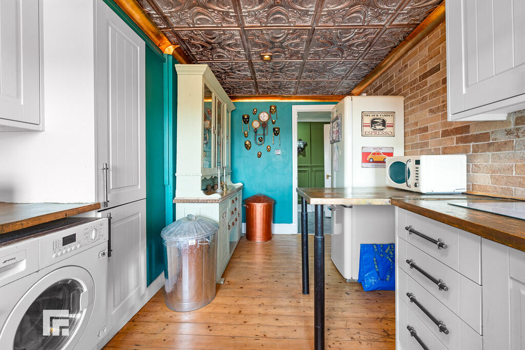 KITCHEN15' 7" x 9' 2" (4.77m x 2.81m) Modern kitchen. Two arched double glazed wooden framed windows, to front aspect. Exposed floorboards. Part tiled exposed brick effect walls. Fitted wall and base units, with work surfaces incorporating composite sink and drainer with mixer tap. Ample storage. Integrated oven, with four ring induction hob and extractor hood over. Coving. Space for fridge freezer, washing machine and dishwasher. Pendant light fittings and spotlights.
