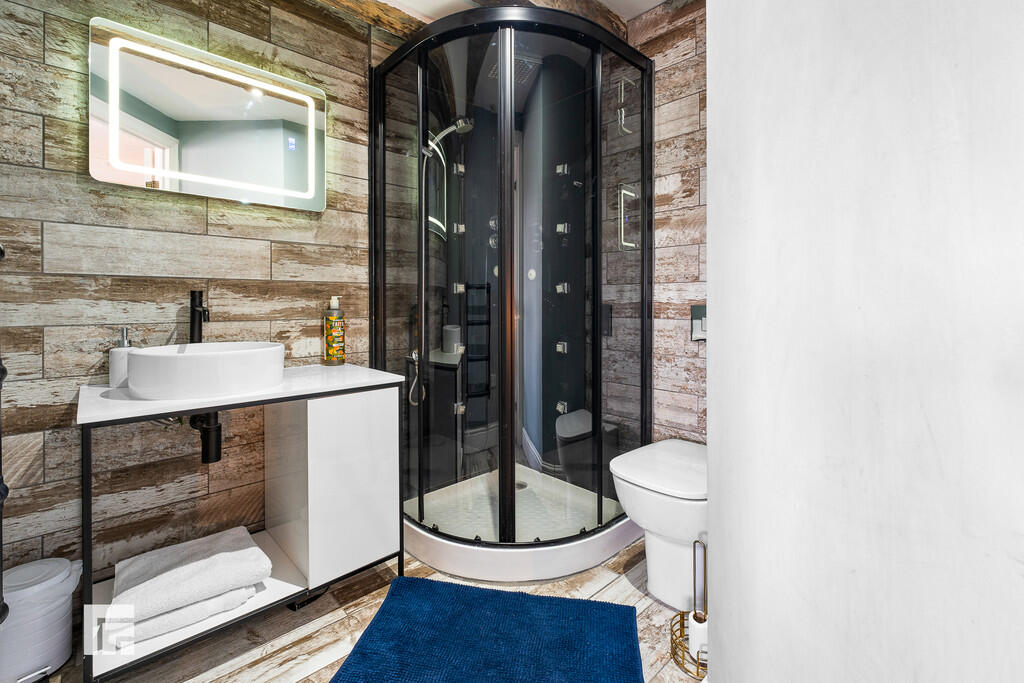 BATHROOM8' 10" x 7' 7" (2.70m x 2.33m) Modern bathroom. Tiled flooring. Part tiled walls. Panelled bath, with mains powered rainfall shower over with separate shower fixture and glass shower screen. Vanity enclosed wash hand basin with hot and cold tap. W.C. Wall mounted cabinet over. Heated towel rail. Cast iron pillar. Extractor fan. Spotlights.
