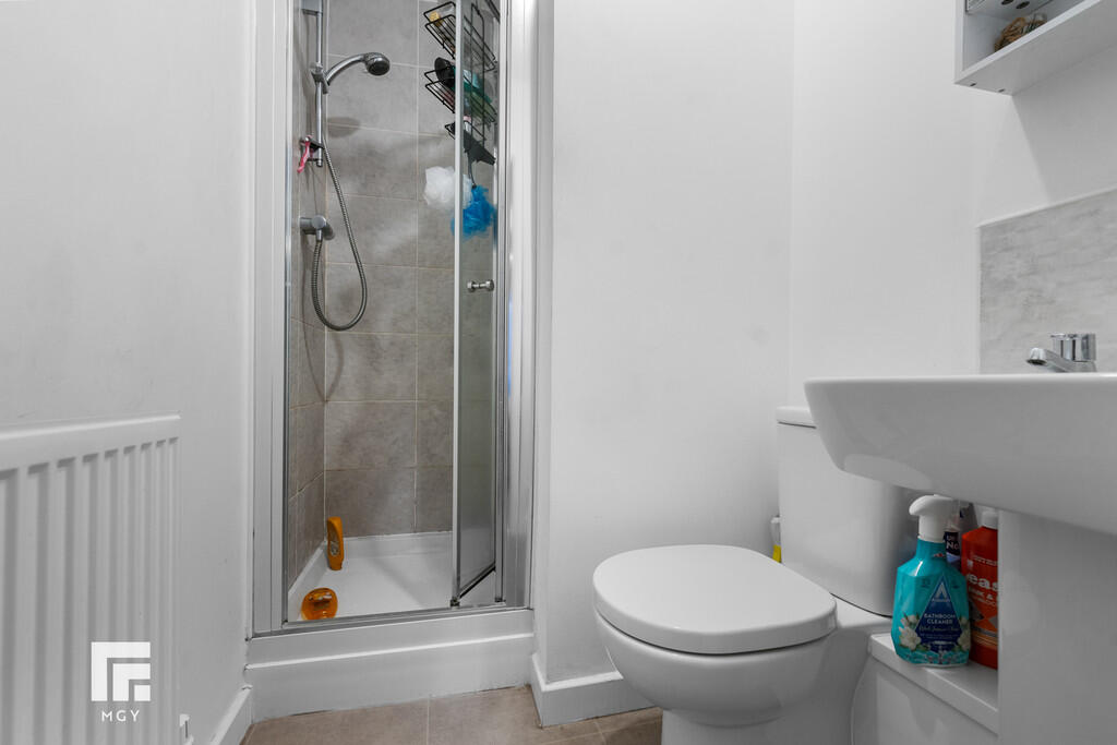 EN-SUITE With suite to comprise closed cistern w.c, wash hand basin and glazed shower enclosure with shower insitu. Radiator. Vinyl flooring.
