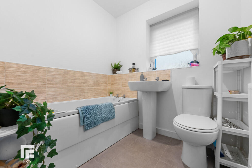 BATHROOM With suite to comprise panel bath, close coupled w.c and wash hand basin. Radiator. Vinyl flooring.