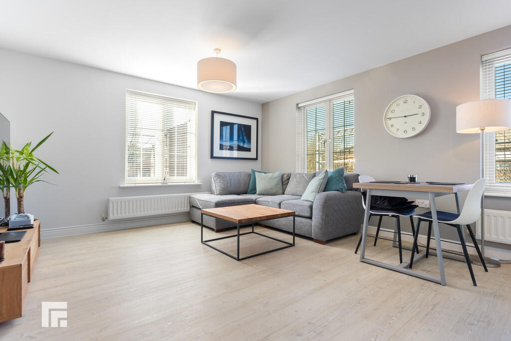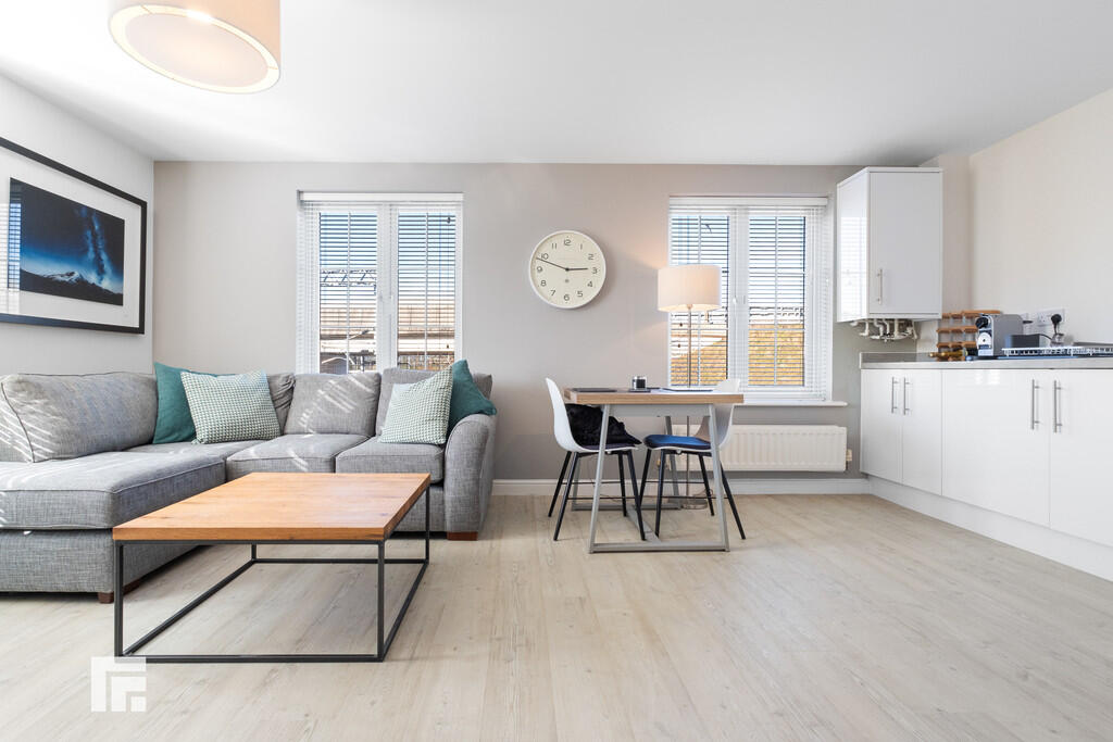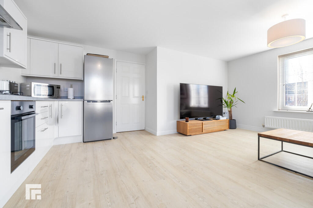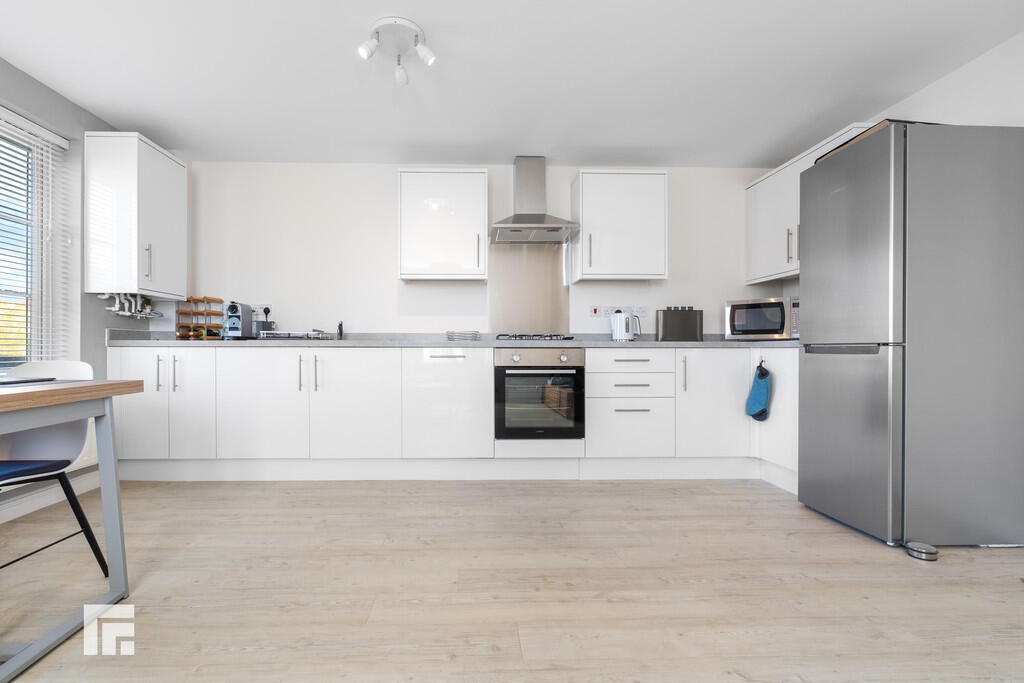 LOUNGE/DINERANDKITCHEN18' 2" x 15' 9" (5.55m x 4.82m) With kitchen well appointed along two sides in white high gloss fronts with chrome bar handles beneath concrete effect laminate worktop surface. Inset stainless steel sink with side drainer. Inset four ring gas hob with cooker hood above and oven below. Space for fridge freezer. Integrated dishwasher. Integrated washing machine. Matching range of eye level wall cupboards. Concealed 'Baxi' combi gas central heating boiler. Ample space for large family dining and seating area. Three windows making for a bright reception. LVT flooring. Two radiators.