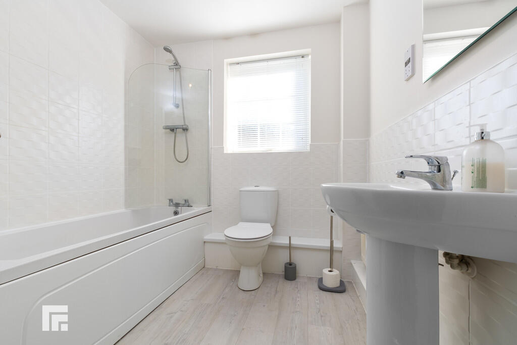 FAMILYBATHROOM7' 0" x 6' 6" (2.14m x 1.99m) Quality white suite comprising low level wc, wash hand basin, panelled bath with chrome shower above and swivel glass shower screen. Wall tiling to splash back areas. Obscured glass window. Extractor fan. LVT flooring. Electric shaver point. Radiator.