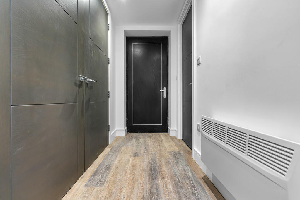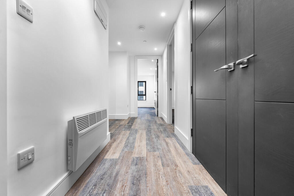 ENTRANCEHALL Entered via Verona Black door. Classic Rustic Oak LVT wooden flooring. Video entry intercom system. Wall mounted electric heater. Storage cupboard housing hot water tank. Spotlights to ceiling.