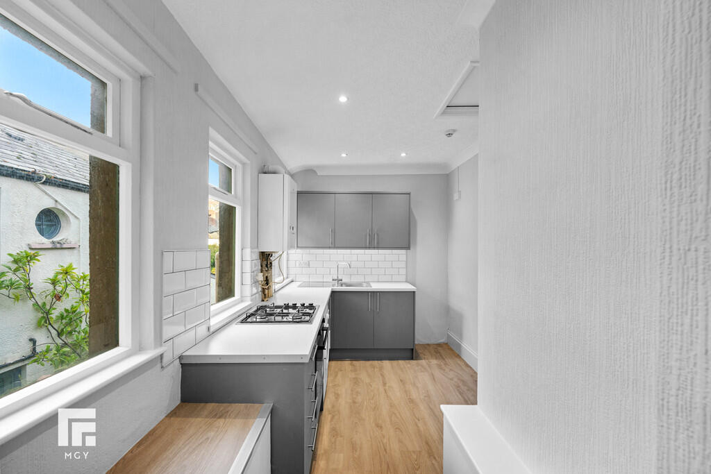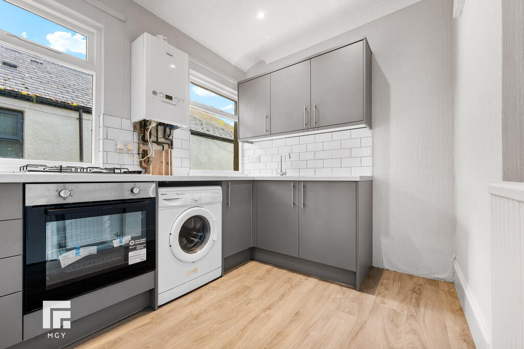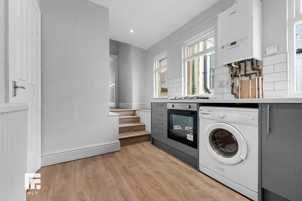 KITCHEN17' 7" x 7' 4" (5.38m x 2.24m) Continuation of laminate flooring. Radiator. Pendant light fitting. Modern fitted kitchen with a range of wall, base and drawer units with worktops over incorporating stainless steel sink and drainer with hot and cold tap over and gas hob with oven beneath. Space for washing machine and fridge/freezer. Tiled splashback. Three double glazed windows to side. Wall mounted boiler. Steps leading to lounge and bedroom.
