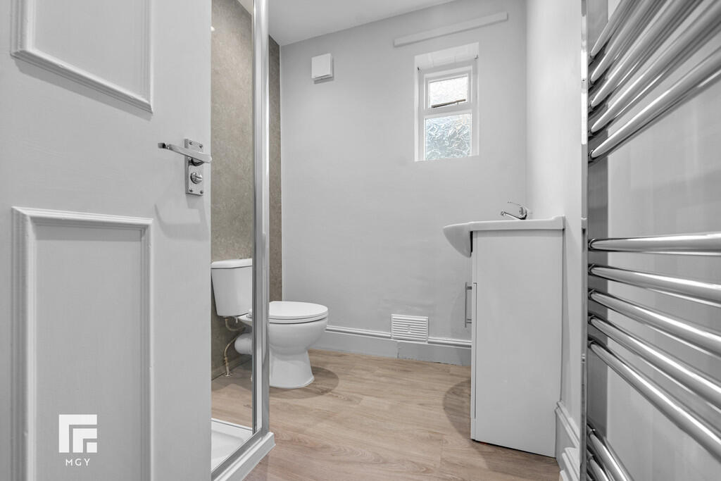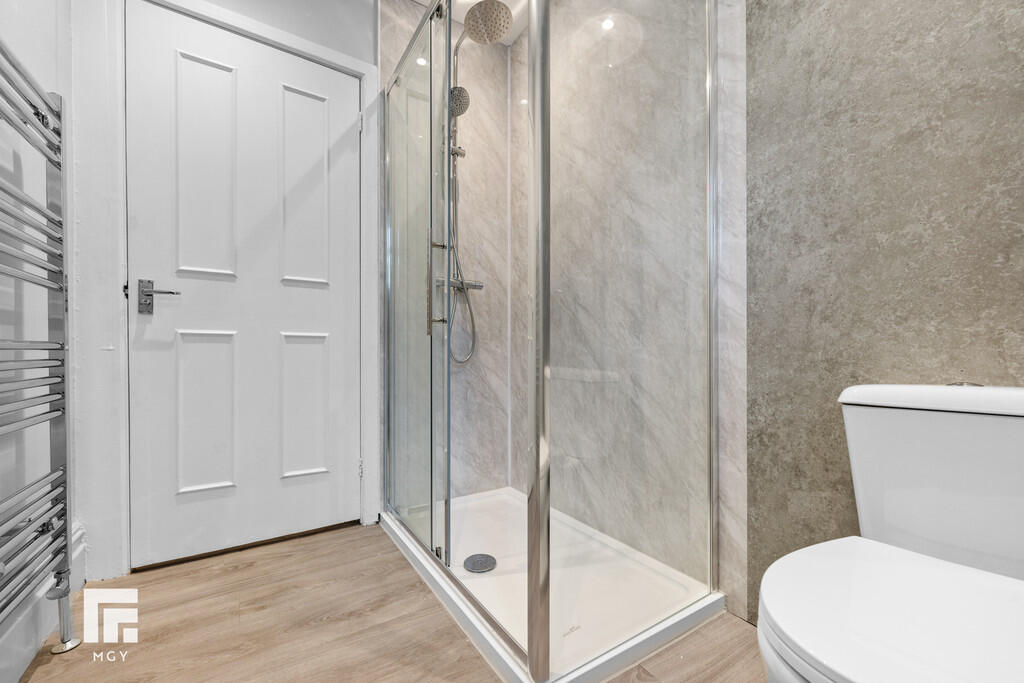 BATHROOM5' 4" x 7' 0" (1.63m x 2.15m) Laminate flooring. Vanity wash hand basin with mixer tap over and storage beneath. WC. Walk in shower cubicle with mains powered shower over. Spotlights. Chrome heated towel rail. Obscure window to side.