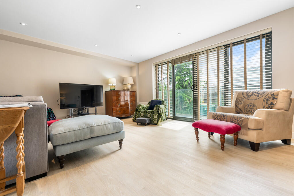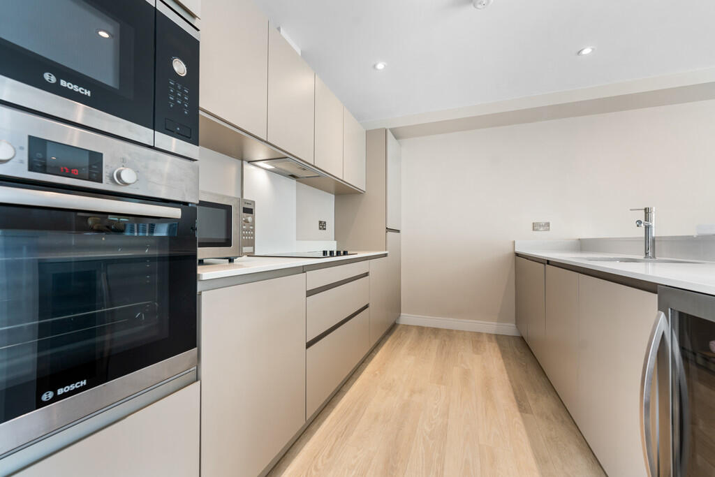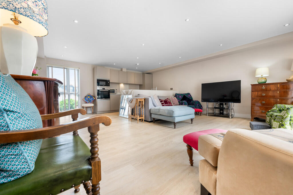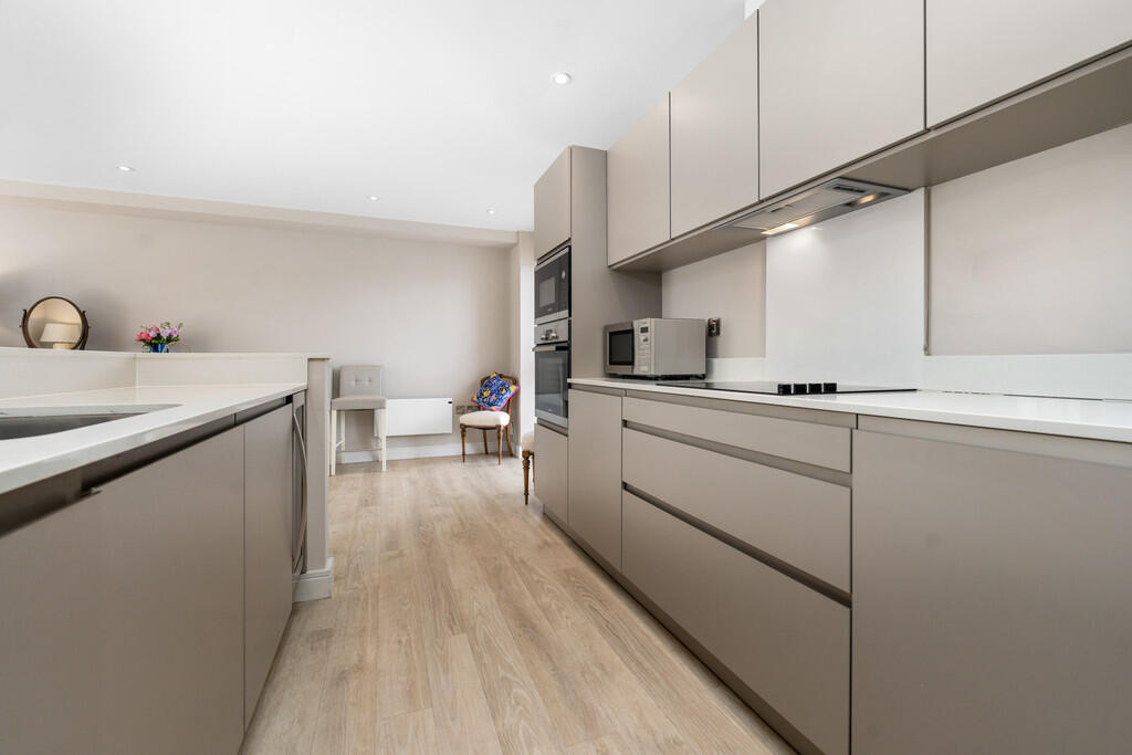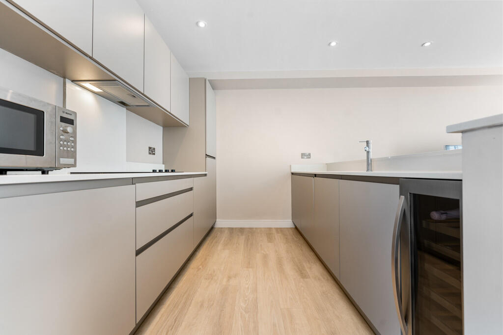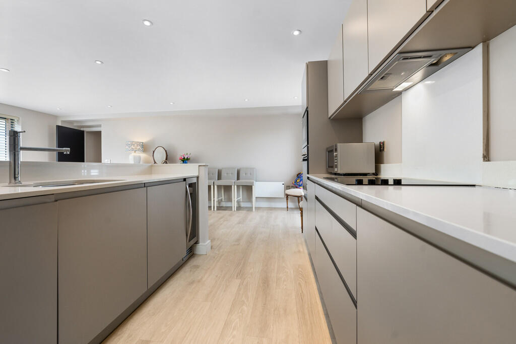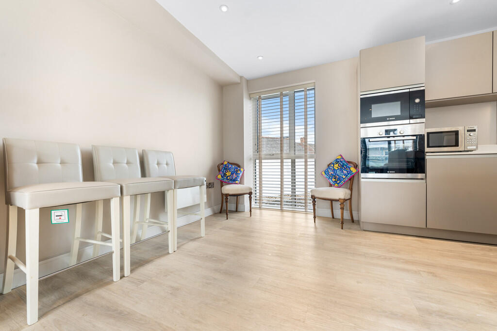 LOUNGE/KITCHEN/DINER18' 4" x 23' 0" (5.60m x 7.02m) Open plan living and kitchen space. Large double glazed uPVC sliding doors with glass Juliet balcony plus additional double glazed uPVC window to rear aspect with fitted wooden shutter blinds. A well appointed modern kitchen fitted with a range of base and eye level touch to open units incorporating double stainless steel sink and drainer with complementary granite work surfaces. Fitted Bosch electric oven, microwave and four ring electric hob with extractor fan over. New integrated fridge/freezer, dishwasher, and separate wine cooler. Luxury Vinyl Tile flooring (LVT). Two electric radiators. TV point. Downlights.