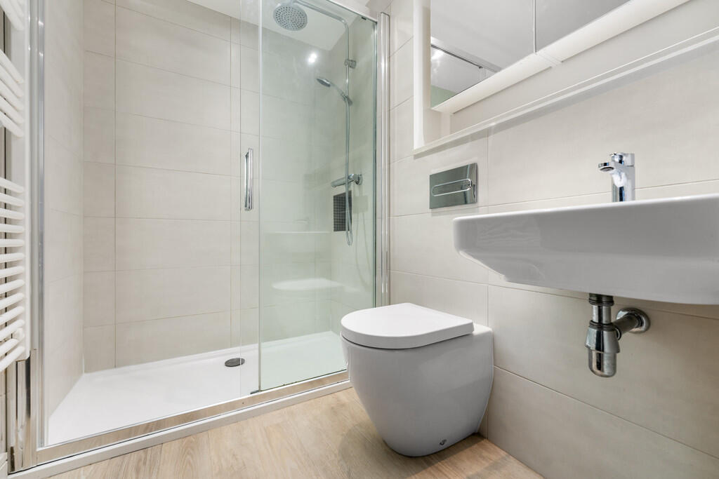 SHOWERROOM6' 10" x 5' 6" (2.10m x 1.70m) Modern low level WC, wash hand basin with fixed mirrored vanity cupboard above. Fitted shower cubicle with mains rainfall shower over and separate fixture. Part tiled walls and splashbacks. Luxury Vinyl Tile flooring (LVT). Heated towel rail. Shaver point. Spotlights. Extractor fan.