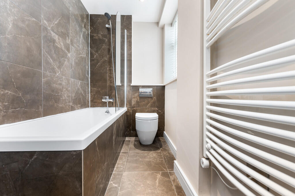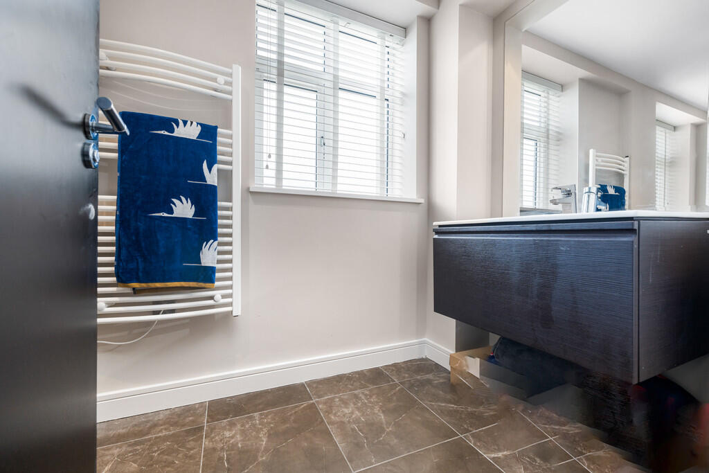 ENSUITE Excellent modern suite comprising: panelled bath, with mains shower over and glass shower screen, contemporary wash hand basin with vanity cupboard underneath and mixer tap over. W.C. Large wall mounted mirror. Two obscure double glazed uPVC windows with fitted wooden shutter blinds. Tiled flooring. Part tiled walls. Heated towel rail. Shaver point. Extractor fan. Spotlights.