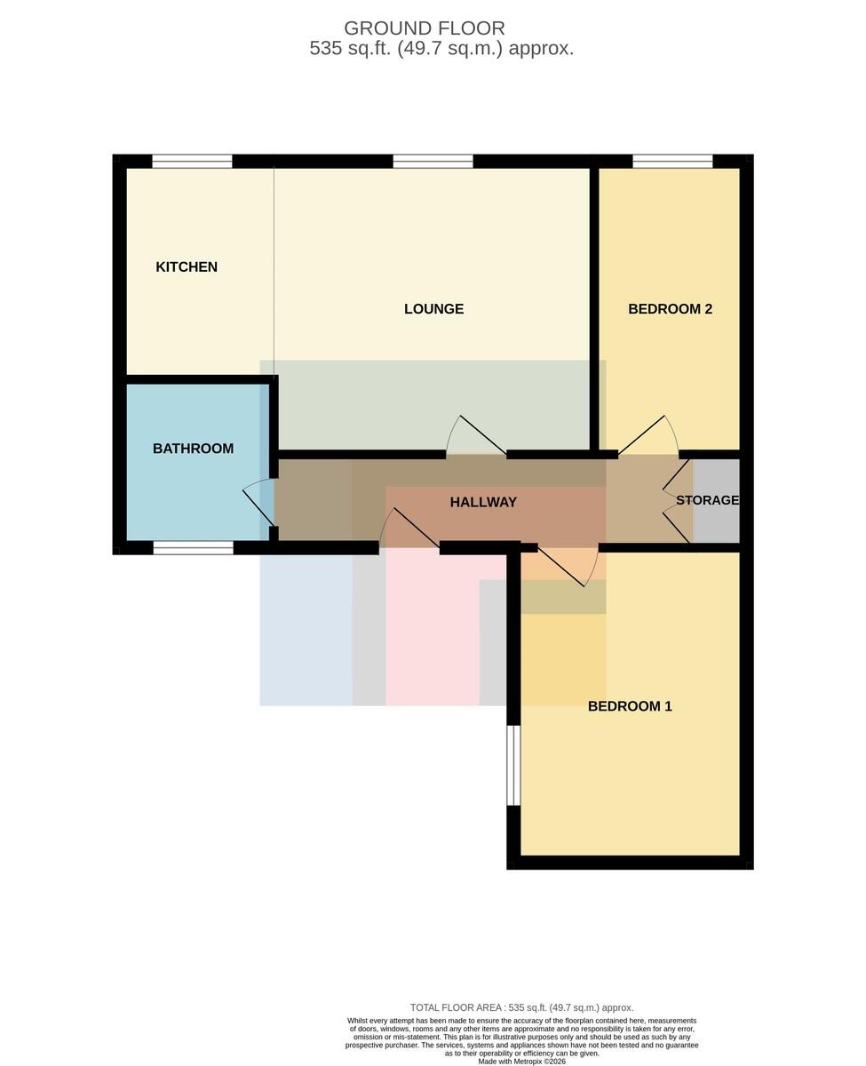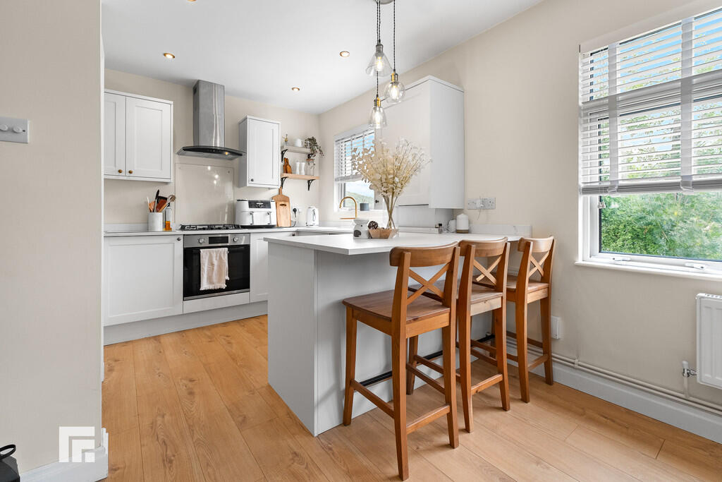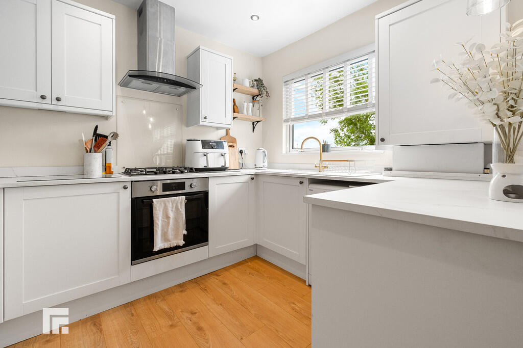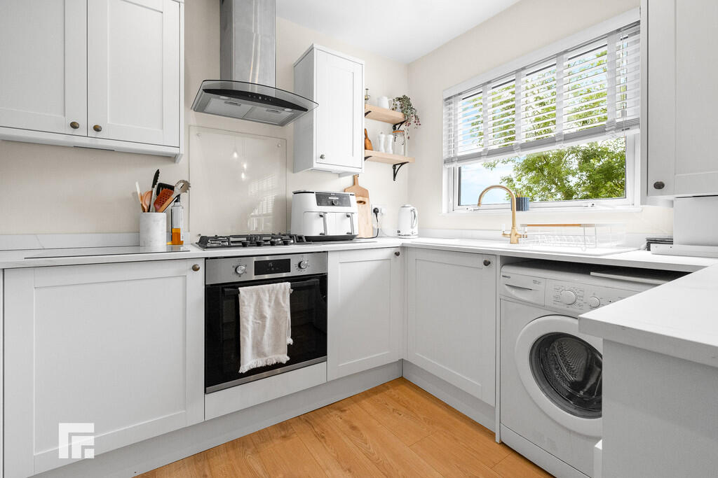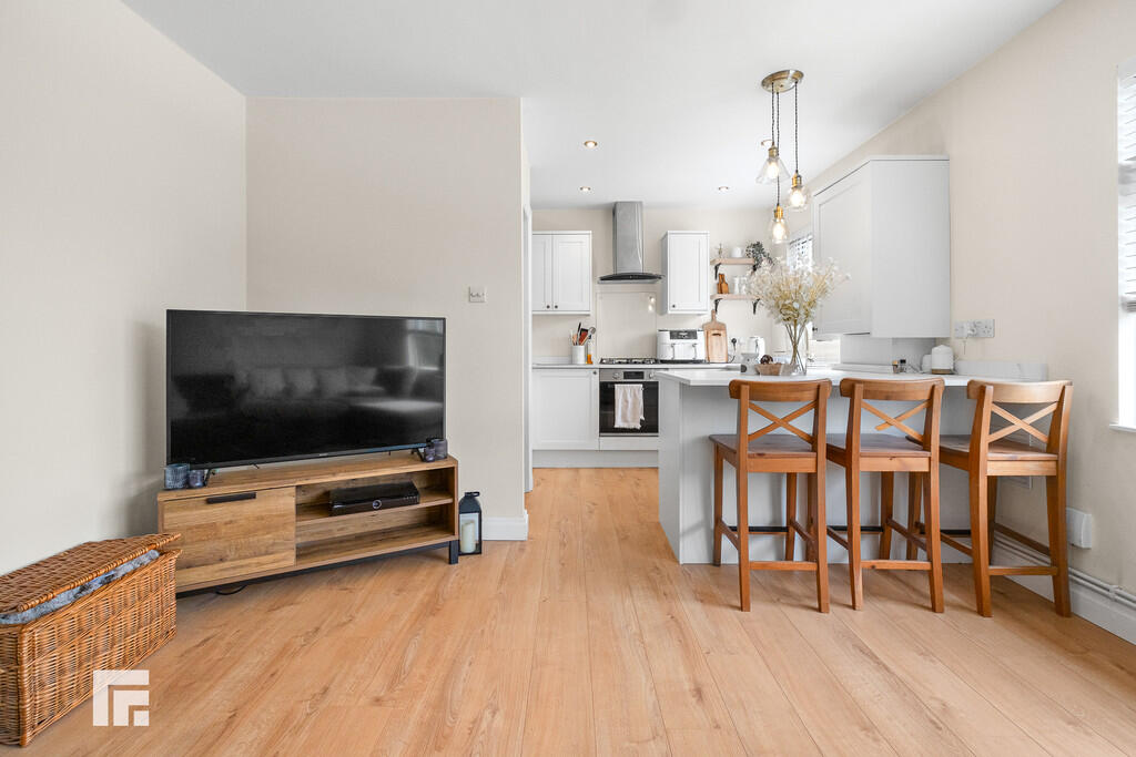 LOUNGEANDKITCHEN21' 1" x 12' 4" (6.43m x 3.78m) A good sized open plan lounge and kitchen. Modern kitchen well appointed along four sides in light panelled fronts beneath slimline laminate worktop surfaces. Inset 1.5 bowl acrylic sink with side drainer. Inset four ring gas hob with curved glass cooker hood above and oven below. Space for fridge freezer. Matching range of eye level wall cupboards. Concealed 'Worcester' combi gas central heating boiler. Plumbing for washing machine. Worktop breakfast bar area. Ample space for seating. Two windows to rear. Laminate flooring. Radiator.