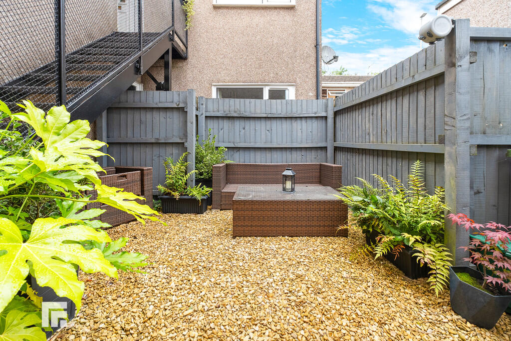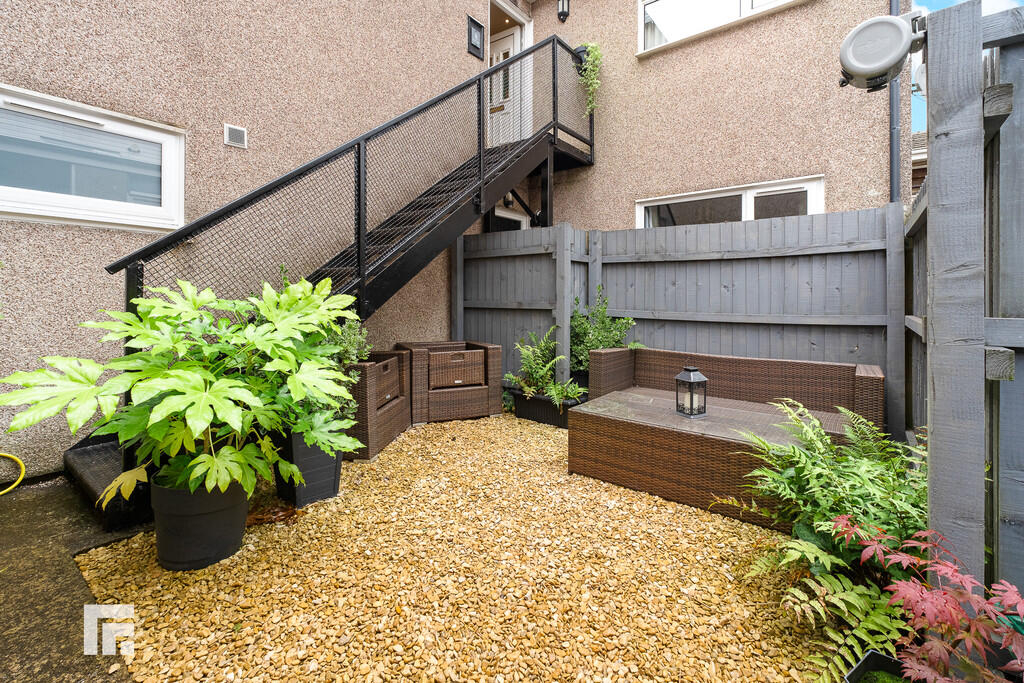 COURTYARDGARDEN Low maintenance enclosed front garden with decorative stone relaxation area. Pathway and steps to first floor access. Large storage measuring 2.17 x 2.10. Garden enclosed by timber fencing and timber gate.
