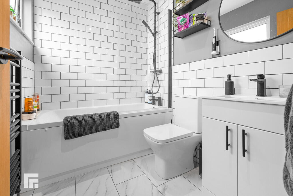FAMILYBATHROOM6' 9" x 5' 4" (2.08m x 1.64m) Modern white suite comprising low level wc, vanity wash basin with storage below, panelled bath with black twin head shower above. Tiled splash back. Obscured glass window to front. Matte finish marble style tile. Black heated towel rail.