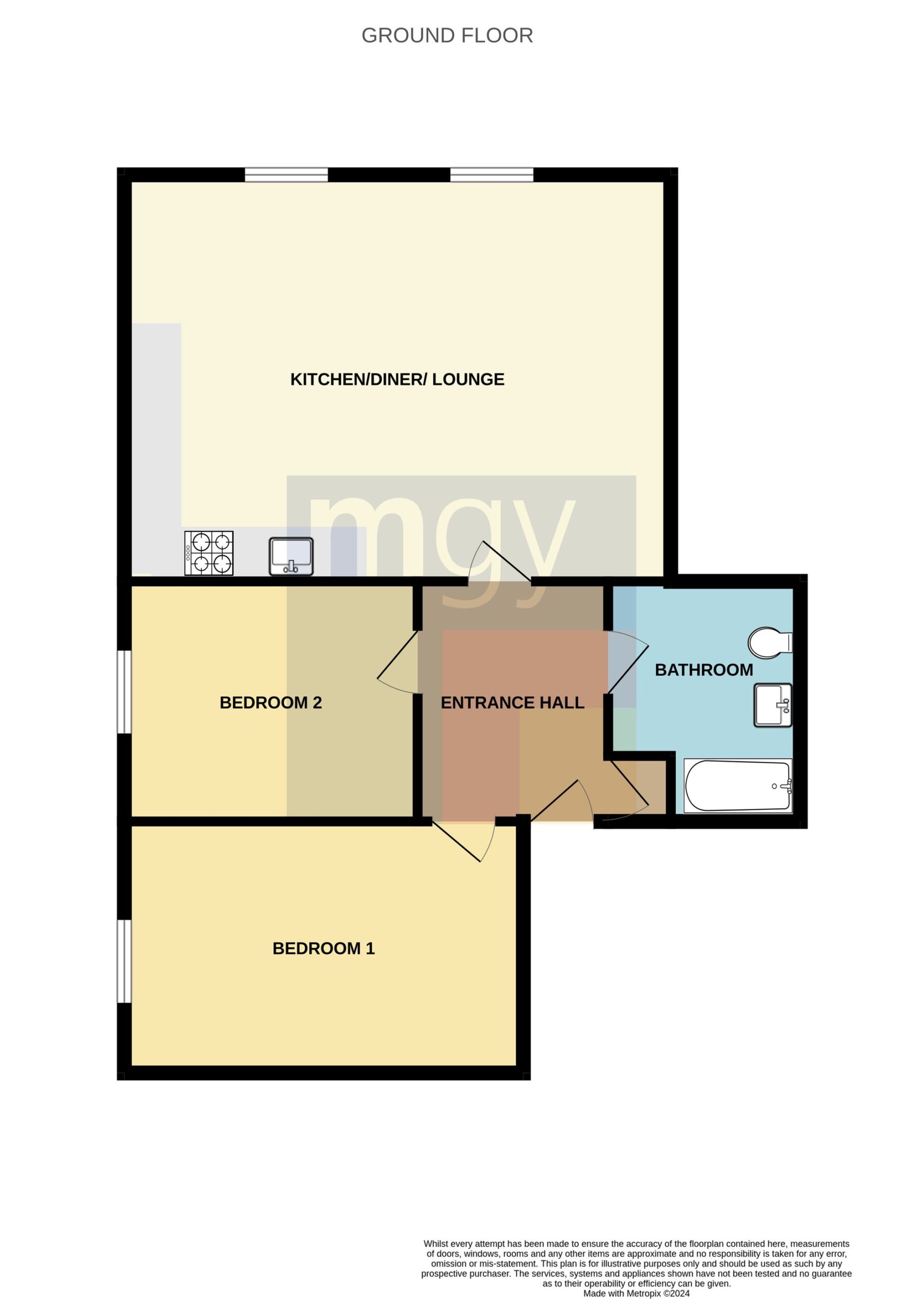 LOUNGE/ KITCHEN/ DINER Dimensions: 21' 7" x 16' 2" (6.60m x 4.94m). A spacious open plan area with 2 double glazed windows to the side aspect. Laminate flooring. Modern cream kitchen units with work surfaces incorporating one and a half stainless steel sink unit with mixer tap. Built in fridge / freezer and washing machine. Built in oven with ceramic hob and extractor over. 2 wall mounted electric heaters.
