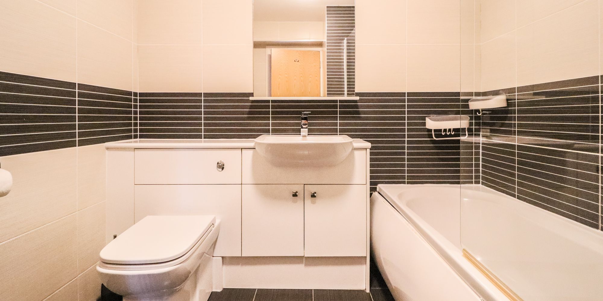 BATHROOM Dimensions: 8' 5" x 7' 5" (2.58m x 2.28m). Tiled floor and walls. Panelled bath with mixer tap and shower over, vanity enclosed wash hand basin with mixer tap and with cupboards below, w.c. Chrome heated towel rail.