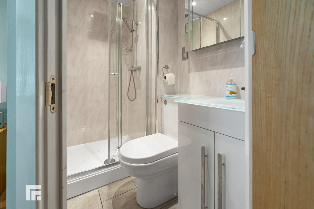 ENSUITE5' 0" x 3' 10" (1.53m x 1.17m) Modern white three-piece-suite comprising WC, Vanity wash hand basin with mixer tap over and storage beneath. Walk in shower cubicle with mains powered rainfall shower over and separate shower head fixture and glass shower screen. Wall mounted cabinet with illuminated vanity mirror. Wall mounted fan heater. Extractor fan. Shaver point. Tiled flooring. Spotlights.