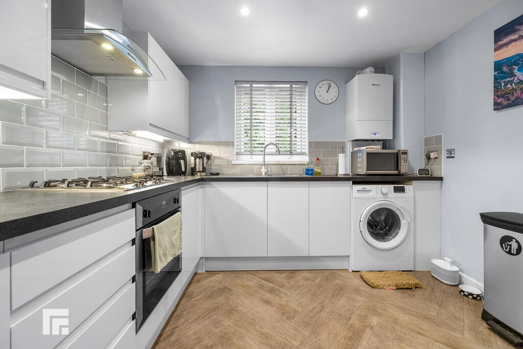 KITCHEN10' 4" x 9' 6" (3.15max x 2.92m) Modern fitted separate kitchen with a range of wall, base and drawer units with worktops incorporating stainless steel sink with mixer tap. Four ring gas hob with extractor fan above and electric oven beneath. Ample storage. Integrated dishwasher and space for appliances such as: fridge/freezer and washing machine. Tiled splashback. Wall mounted Worcester boiler. Spotlights. Vinyl flooring and partly tiled walls. Double glazed window with fitted blinds to rear aspect. Radiator.