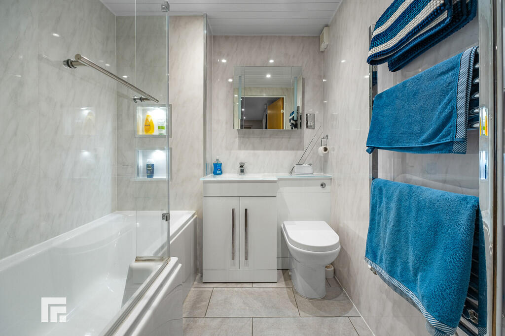 BATHROOM6' 5" x 6' 1" (1.98m x 1.87m) Modern white three-piece-suite comprising WC, vanity enclosed wash hand basin with mixer tap over and storage beneath, and panelled bath with mains powered rainfall shower over, separate shower head fixture and glass shower screen. Wall mounted cabinet with illuminated vanity mirror. Chrome heated towel rail. Extractor fan. Shaver point. Tiled flooring. Spotlights.
